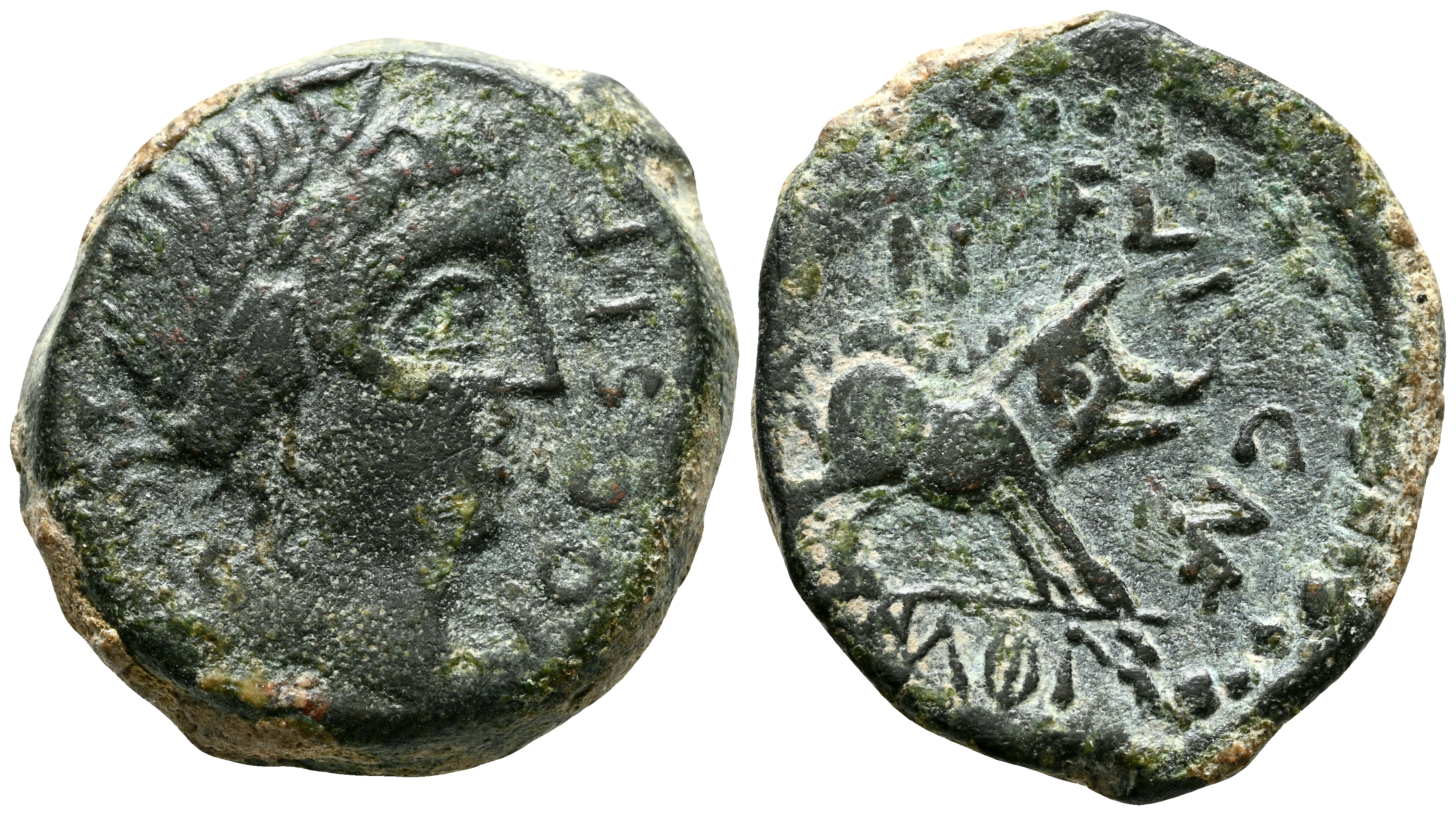 CASTULO (Cazlona, Jaén). Semis. (Ae. 7,25g/20mm). (FAB-728). Anv: Cabeza masculina diademada a derecha, alrededor leyenda: CN VOC STFR. Rev: Toro a derecha, encima: CN creciente, delante: CN FVL CN F, debajo leyenda ibérica: CaSTeLe. MBC/MBC+.
