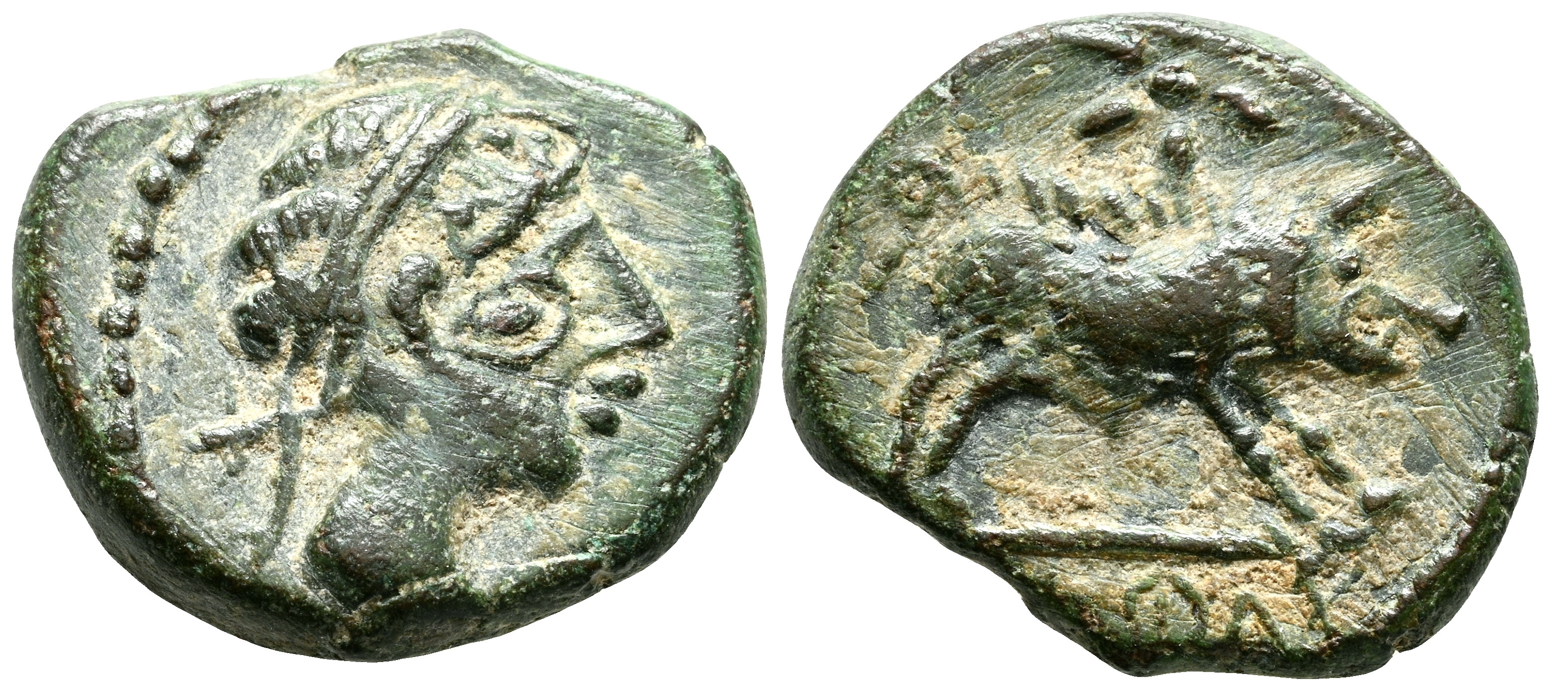 CASTULO (Cazlona, Jaén). Cuadrante. (Ae. 2,73g/16mm). 180 a.C. (FAB-735). Anv: Cabeza masculina diademada a derecha. Rev: Jabalí a derecha, encima estrella, debajo de línea leyenda ibérica: CaSTeLE. MBC.