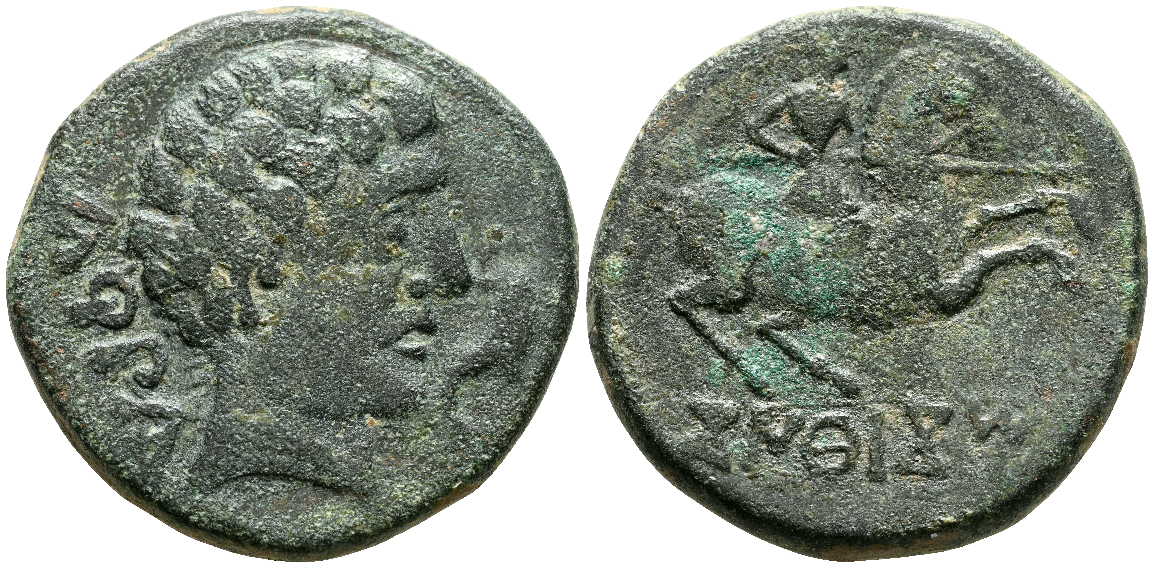 CONTERBIA CARBICA (Huete, Cuenca). As. (Ae. 9,97g/25mm). 120-80 a.C. (FAB-846). Anv: Cabeza masculina a derecha, detrás leyenda: CaRBiCa, delante delfín. Rev: Jinete con lanza a derecha, debajo leyenda ibérica bajo línea: CoNTeBaCoM. MBC-.
