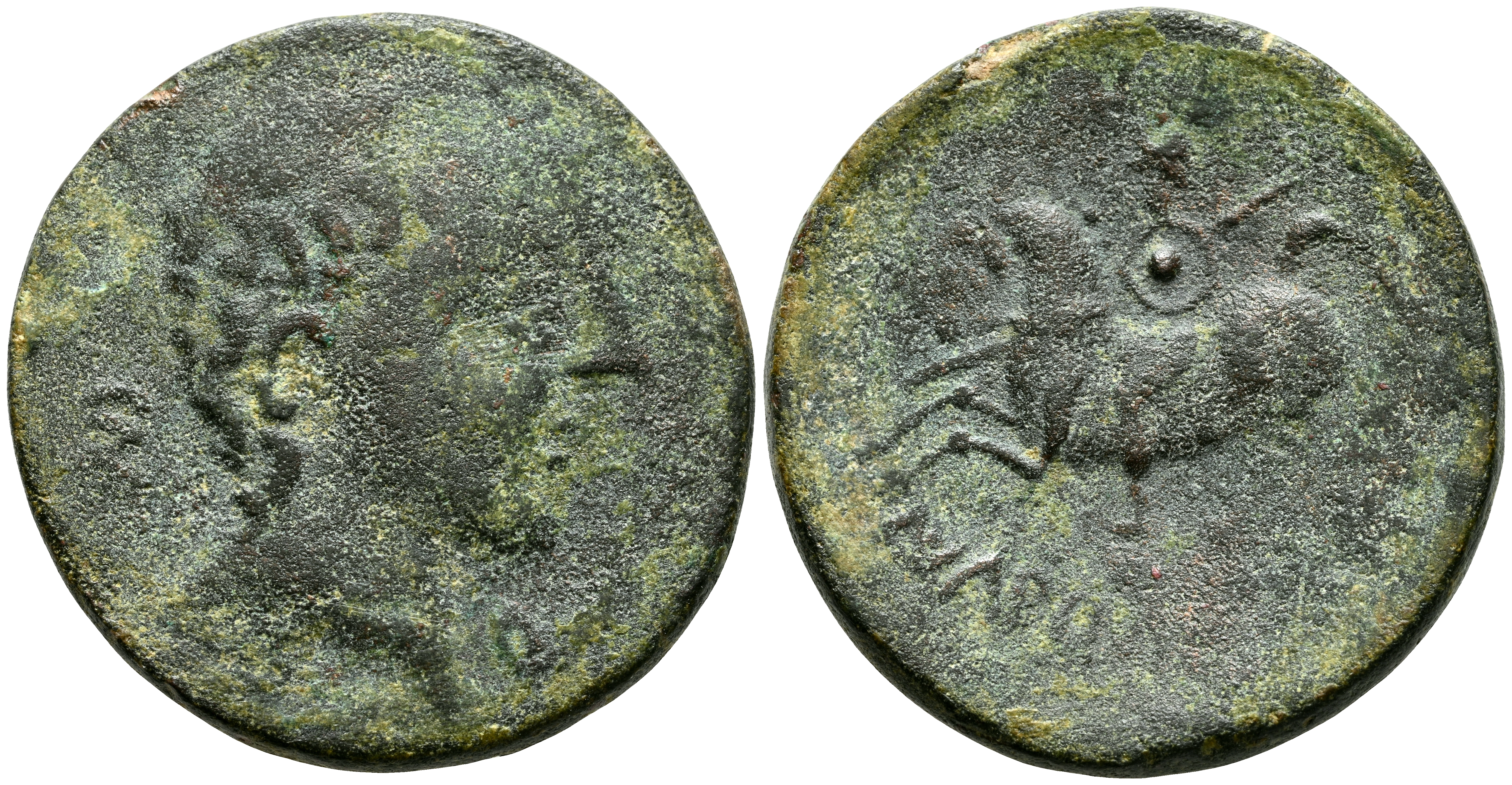 ICALCUNSCEN (Iniesta, Cuenca). As. (Ae. 14,41g/29mm). 120-20 a.C. (FAB-1415). Anv: Cabeza masculina a izquierda, detrás CNF y delante Q. Rev: Jinete con lanza y escudo a izquierda, debajo de línea leyenda ibérica: ICaLCuNSCeN. BC+.