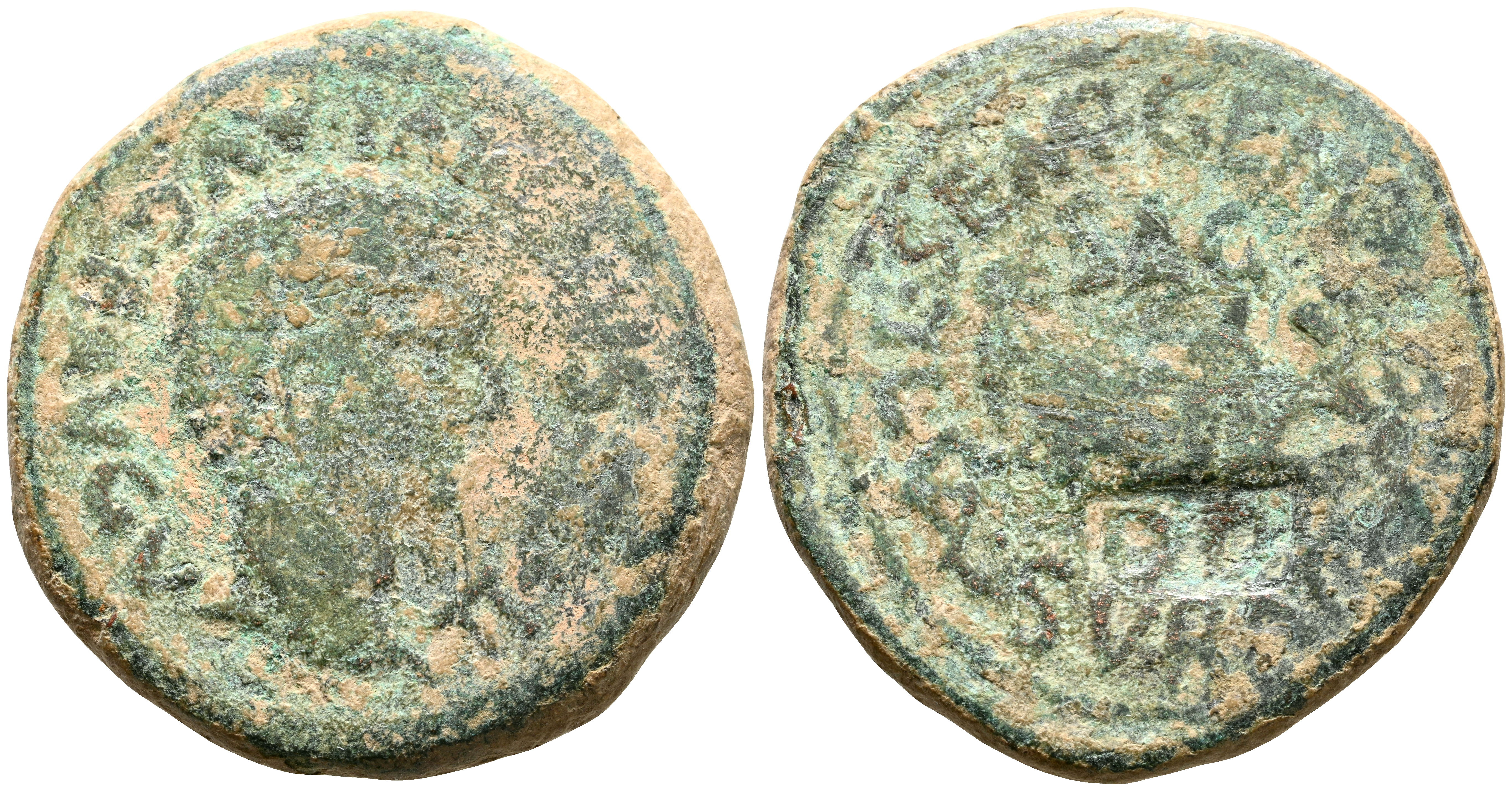 ARSE-SAGUNTO (Sagunto, Valencia). As. (Ae. 14,00g/29mm). 14-36 d.C. (FAB-2091). Anv: Cabeza de Tiberio a derecha, alrededor leyenda: TI CAESAR DIVI AVG F AVG. Rev: Nave, encima SAG, alrededor leyenda: L AE MAXIMO M BAEB SOBRINO AED. MBC-. Contramarca DD en reverso.