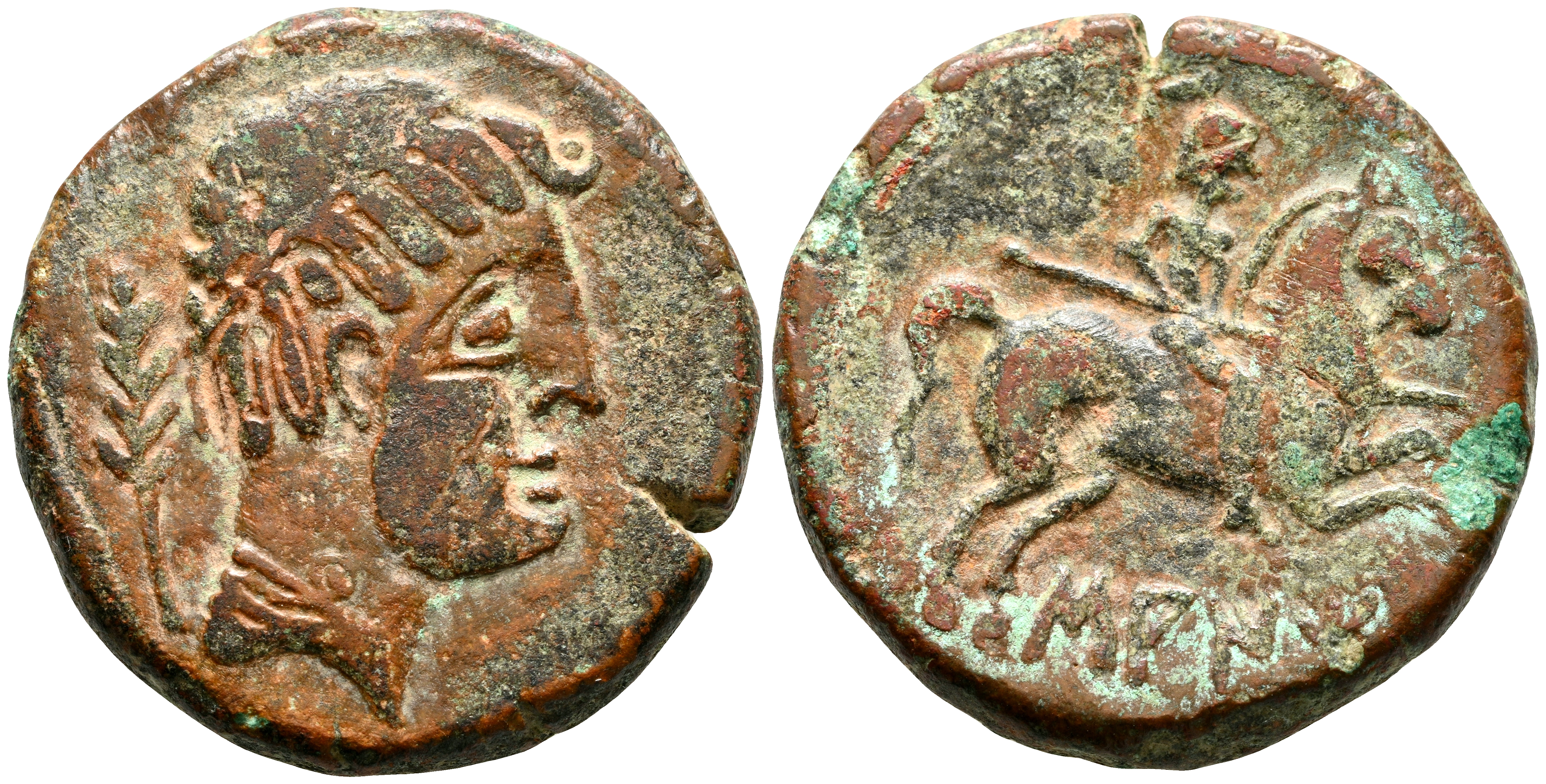SAITI (Xátiva, Valencia). As. (Ae. 14,74g/27mm). 120-20 a.C. (FAB-2099). Anv: Cabeza masculina diademada a derecha, detrás palma. Rev: Jinete con lanza a derecha, debajo leyenda ibérica: SAITi. MBC-/BC+. Oxidaciones.