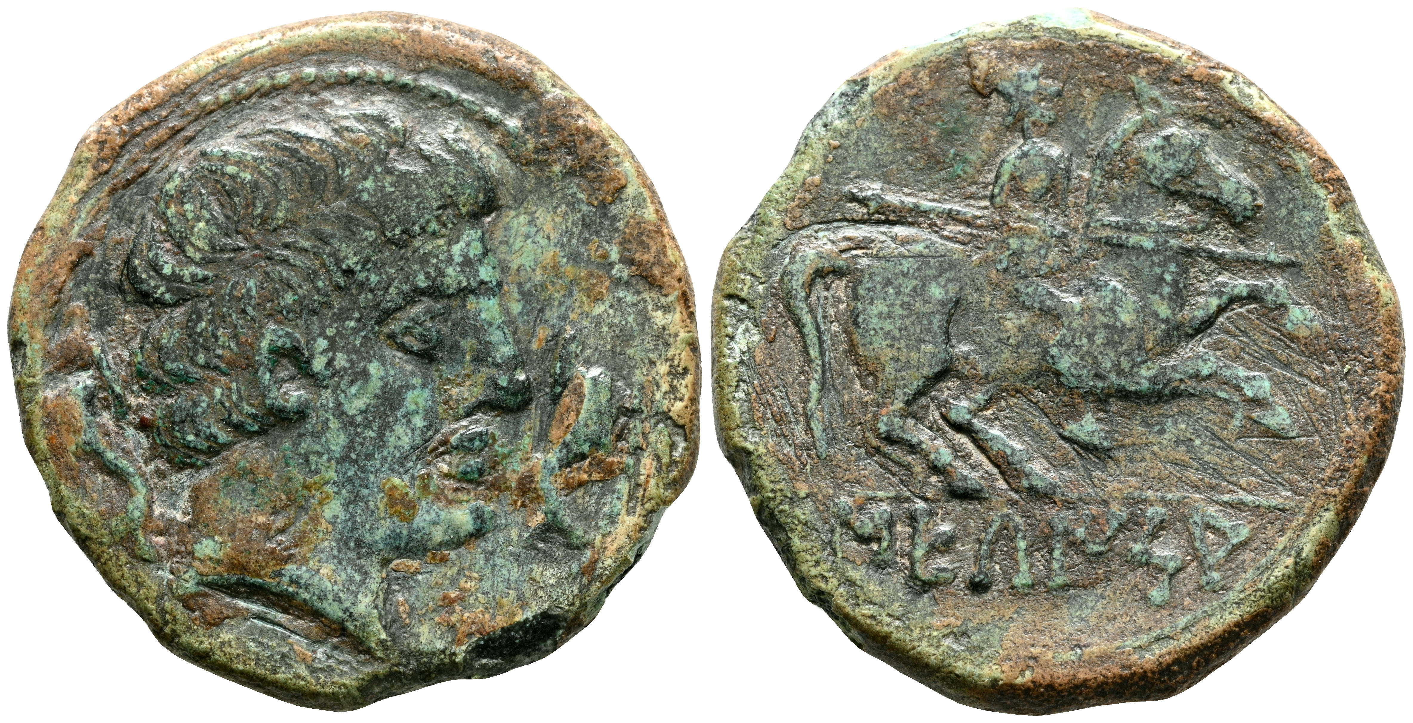 SECAISA (Segeda, Zaragoza). As. (Ae. 8,35g/24mm). 120-20 a.C. (FAB-2131). Anv: Cabeza masculina a derecha entre delfines. Rev: Jinete con lanza a derecha, debajo leyenda bajo línea: SECaISA. MBC. Limpiado.
