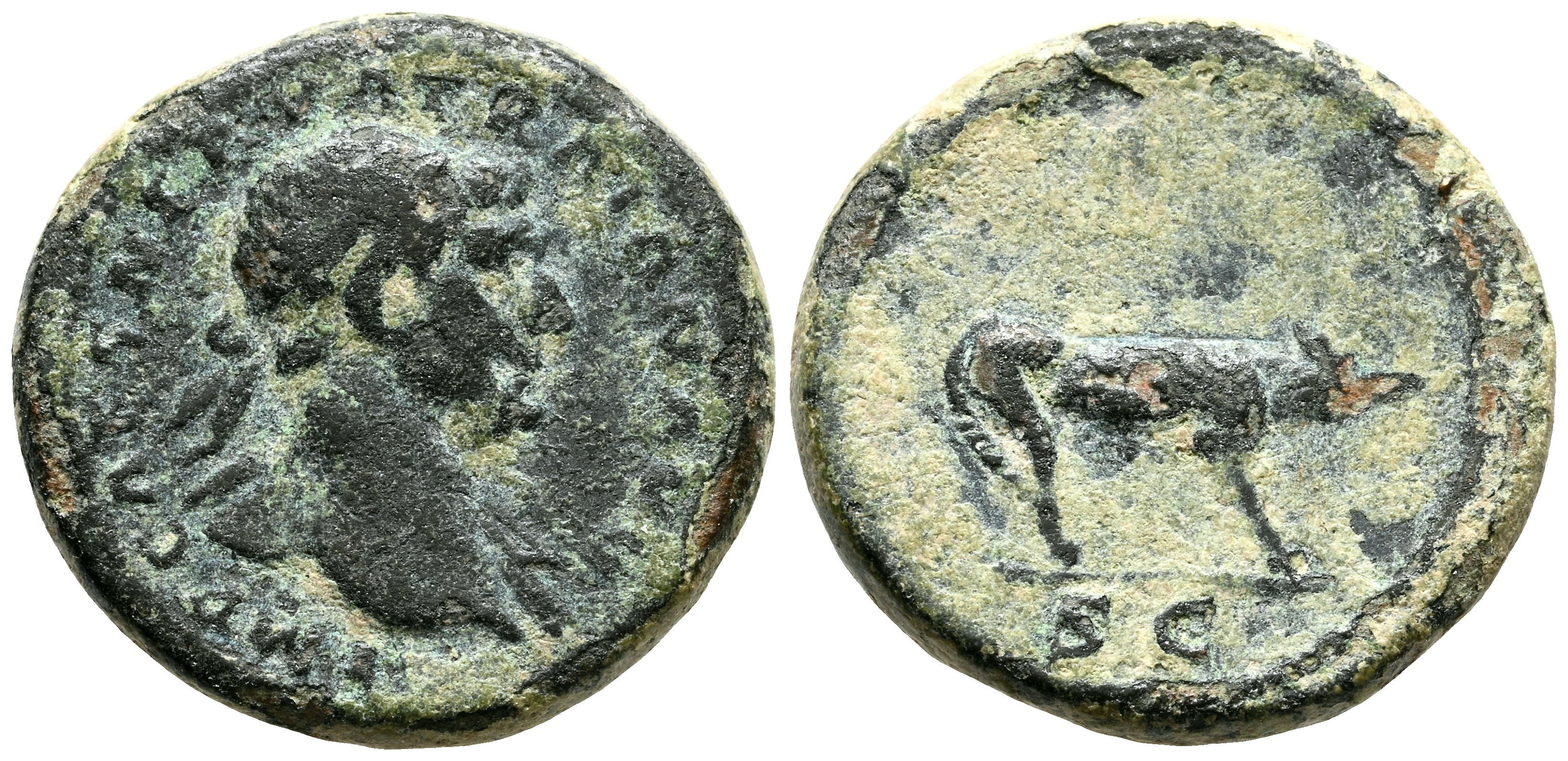 TRAJANO. Cuadrante. (Ae. 3,21g/17mm). 114-117 d.C. Roma. (RIC 692). Anv: Busto laureado de Trajano a derecha, alrededor leyenda: IMP CAES NERVA TRAIAN AVG. Rev: Jabalí a derecha, debajo: SC. MBC-.