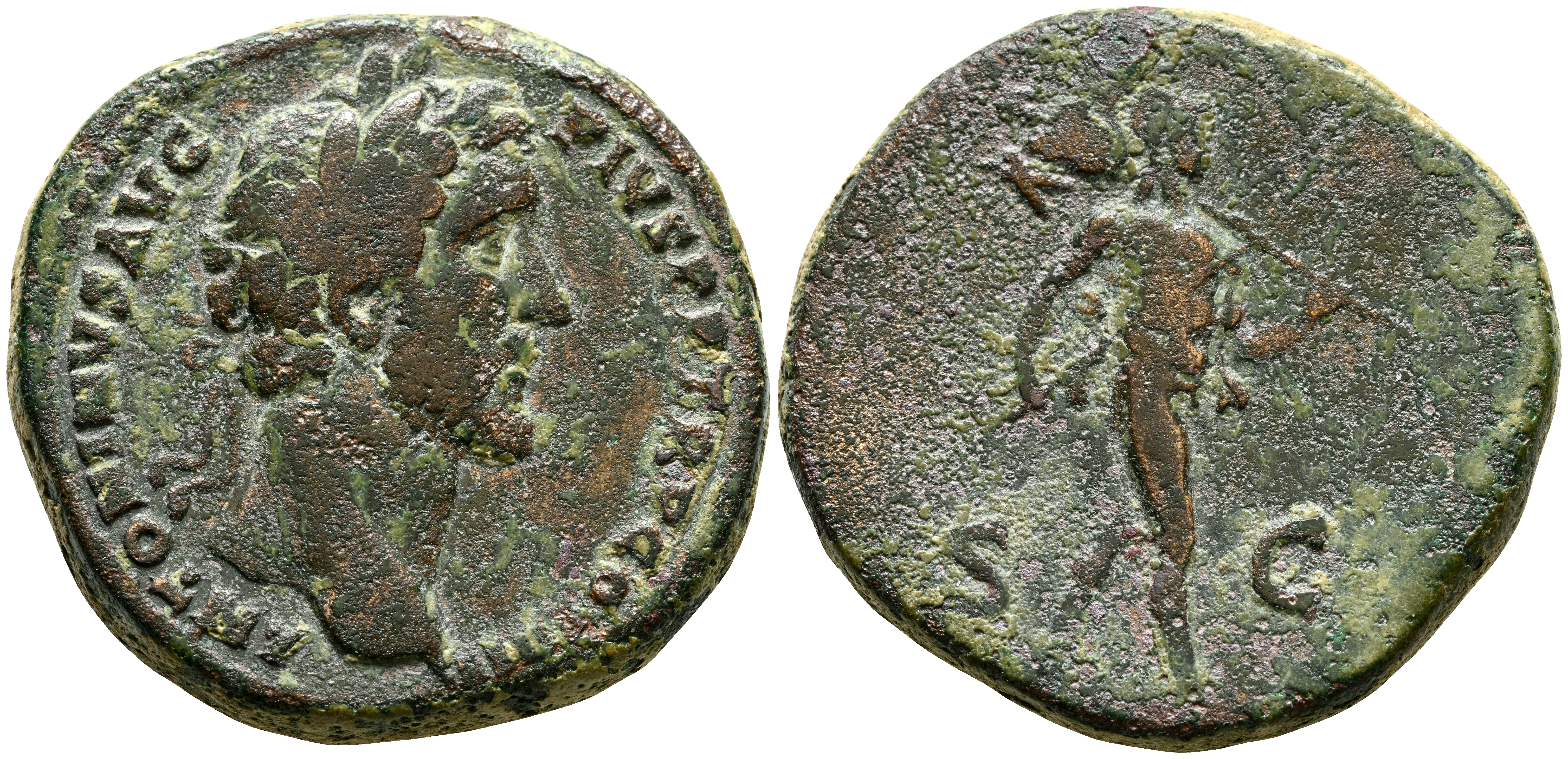 ANTONINO PIO. Sestercio. (Ae. 26,33g/31mm). 147 d.C. Roma. (RIC 778). Anv: Cabeza laureada de Antonino Pío a derecha, alrededor leyenda: ANTONINVS AVG PIVS P P TR P COS IIII. Rev: Marte avanzando a izquierda portando lanza y trofeo, entre S-C. MBC-.