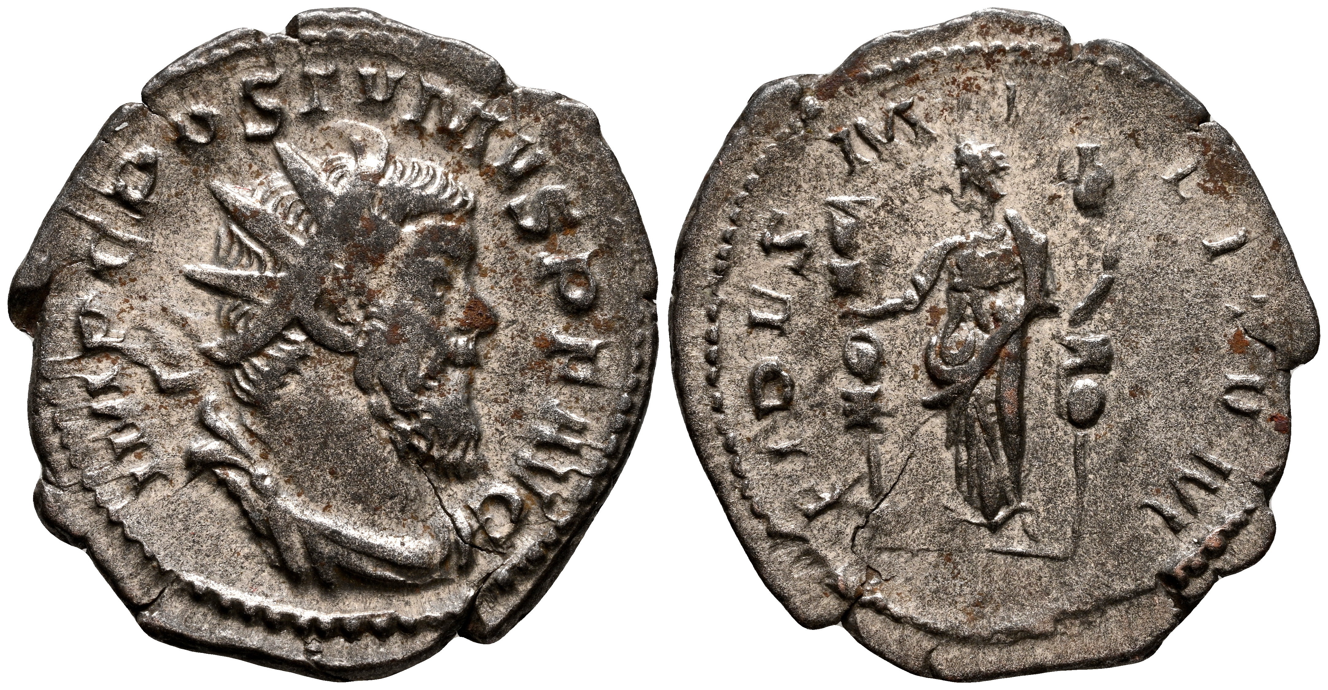 POSTUMO. Antoniniano. (Ar. 3,22g/23mm). 261 d.C. Treveri. (RIC 59). Anv: Busto radiado, drapeado y con coraza de Póstumo a derecha, alrededor leyenda: IMP C POSTVMVS P F AVG. Rev: Fides estante a izquierda portando dos estandartes, alrededor leyenda: FIDES MILITVM. MBC+.