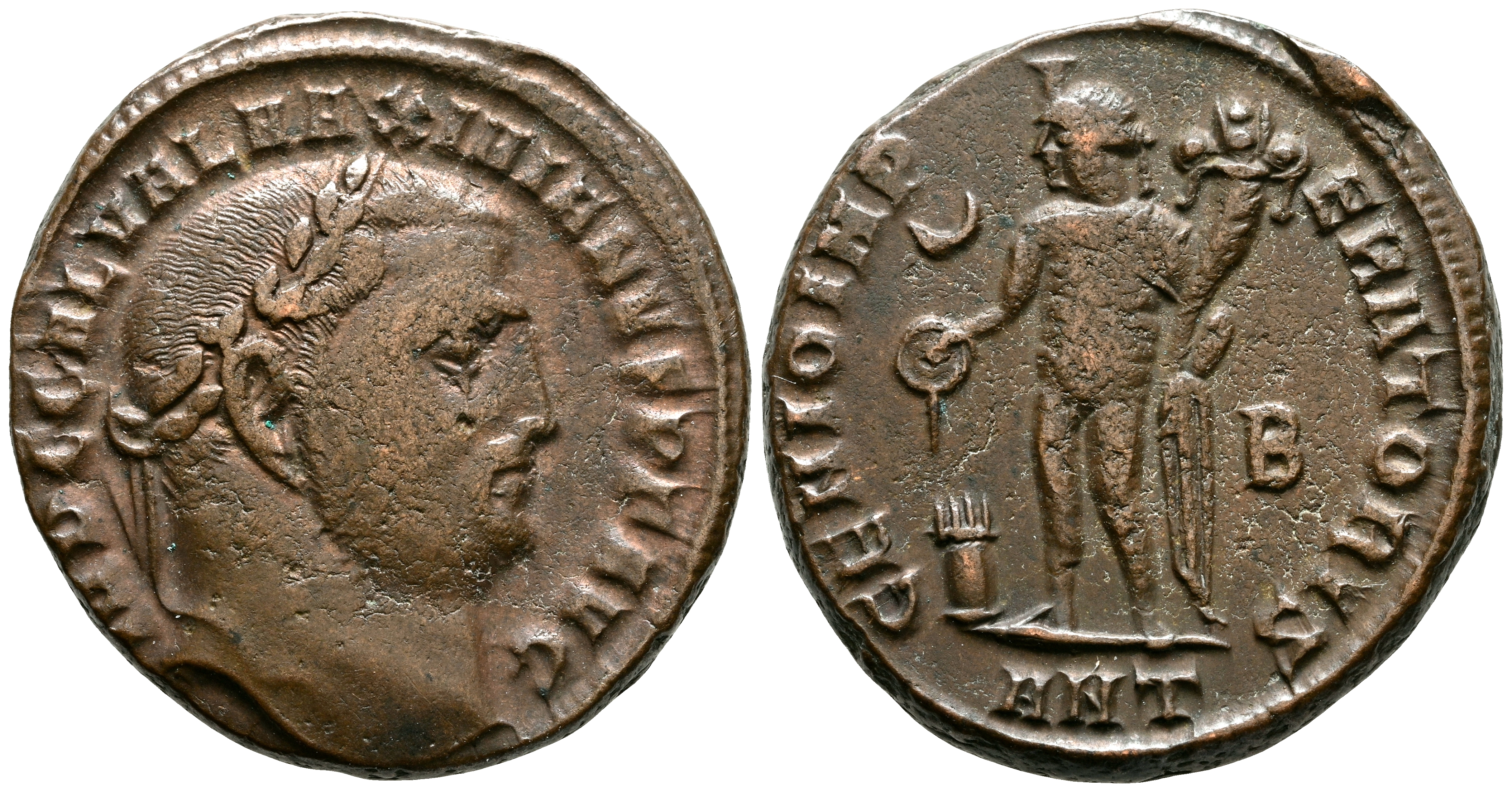 MAXIMINO II. Follis. (Ae. 6,78g/22mm). 305-311 d.C. Antioquía. (RIC 147c). Anv: Cabeza laureada de Maximino II a derecha, alrededor leyenda: IMP C GAL VAL MAXIMINVS PF AVG. Rev: Genio estante a izquierda portando patera sobre altar y cornucopia, en campo: creciente, detrás: B, en exergo: ANT, alrededor leyenda: GENIO IMPERATORIS. MBC.