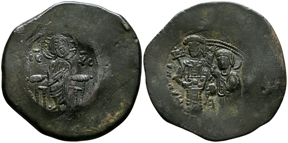 MANUEL I Comnenus. Aspron Trachy. (Ve. 5,12g/31mm). 1167-1183 d.C. Constantinopla. (Seaby 1966). Anv: risto, vestido con túnica y colobium, sedente en un trono sin respaldo, sosteniendo el libro de los Evangelios, entre: IC-XC. Rev: Manuel vestido con divetision y loros, sosteniendo labarum y globo cruciforme, estante de frente, siendo coronado por la Virgen, vestida con túnicas y maphorium, estante a derecha, alrededor leyenda.