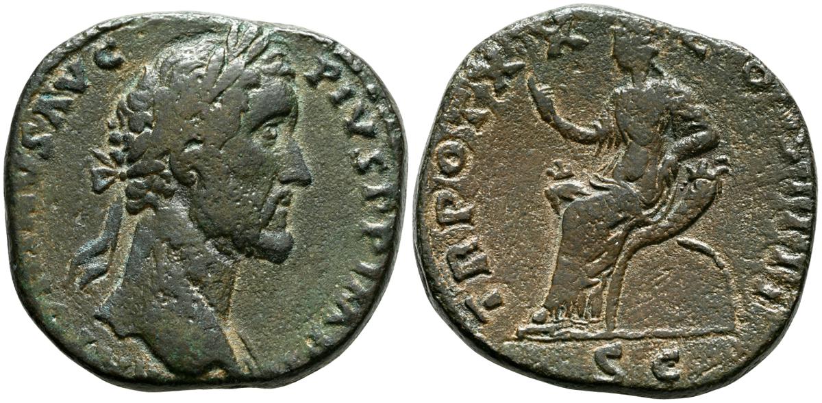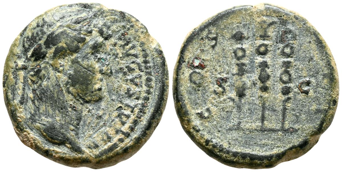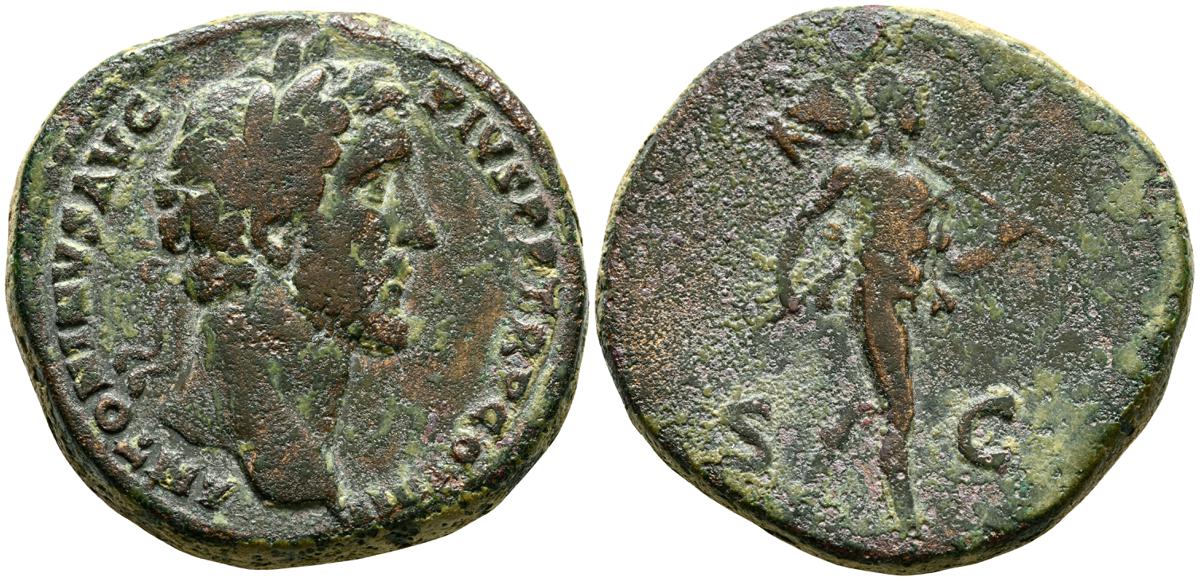 MARCO AURELIO. As. (Ae. 10,88g/25mm). 174-175 d. C. Roma. (RIC 1142). Anv: Cabeza laureada de Marco Aurelio a la derecha, alrededor leyenda: M ANTONINVS AVG TR P XXIX. Rev: Personificación del río Tíber reclinado hacia la izquierda, sosteniendo una caña en la mano izquierda, apoyando el brazo derecho en la proa del barco y apoyando el codo izquierdo en una jarra de la que fluye agua, entre: S-C, alrededor leyenda: IMP VII COS III. BC+. Escasa.