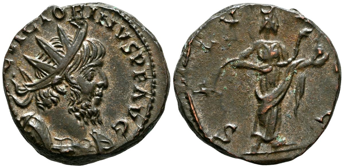 VICTORINO. Antoniniano. (Ae. 3,46g/18mm). 269-270 d.C. Colonia. (RIC 573). Anv: Busto radiado y con coraza de Victorino a derecha, alrededor leyenda: IMP C VICTORINVS P F AVG. Rev: Salus estante a derecha alimentando a serpiente de patera, alrededor leyenda: SALVS AVG. EBC-. Atractivo ejemplar.