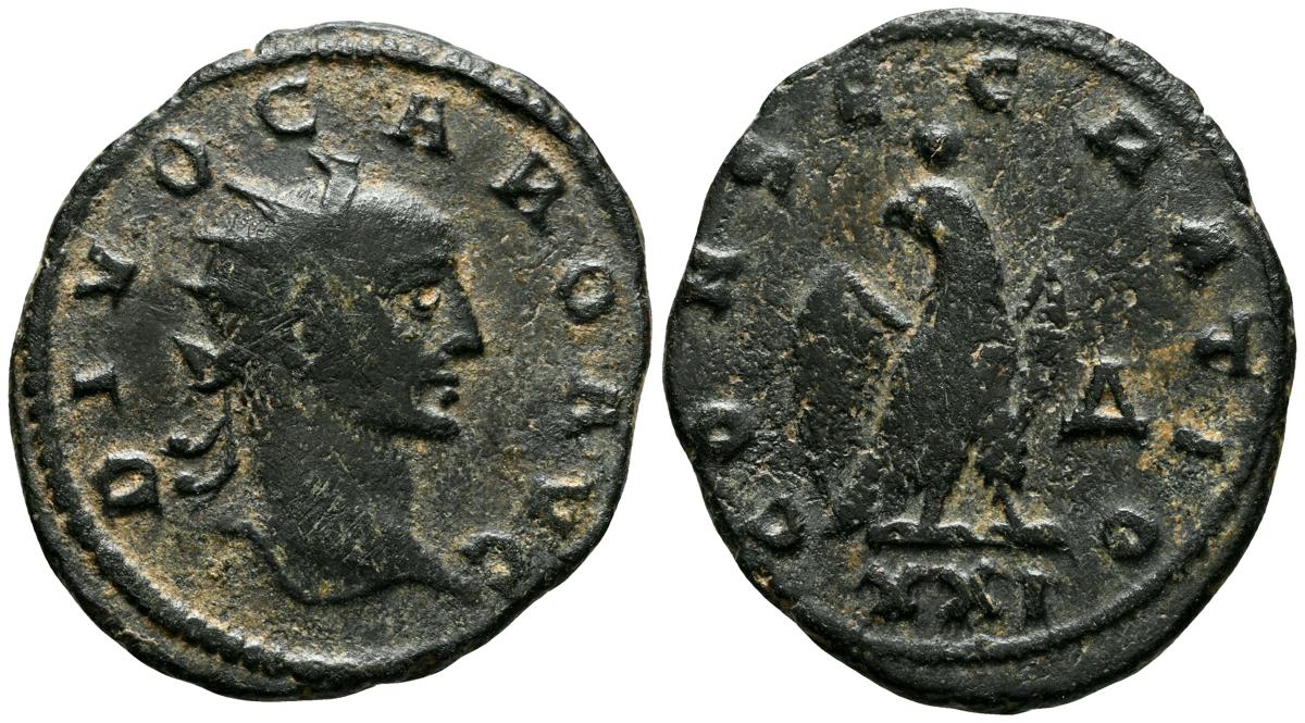 DIVO CARO. Antoniniano. (Ae. 3,13g/22mm). 283 d.C. Antioquía. (RIC 126). Anv: Cabeza radiada de Caro a derecha, alrededor leyenda: DIVO CARO AVG. Rev: Aguila estante de frente mirando a izquierda, en campo: Δ, en exergo: XXI. MBC-. Escaso ejemplar.