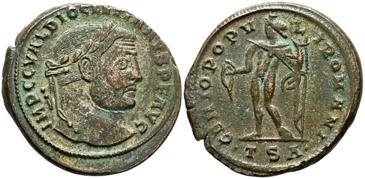 DIOCLECIANO. Follis. (Ae. 10,08g/28mm). 289-299 d.C. Tesalónica. (RIC 19a). Anv: Busto laureado de Diocleciano a derecha, alrededor leyenda: IMPC C VAL DIOCLETIANVS P F AVG. Rev: Genio estante a izquierda portando patera y cornucopia, en exergo: TSA, alrededor leyenda: GENIO POPVLI ROMANI. MBC.