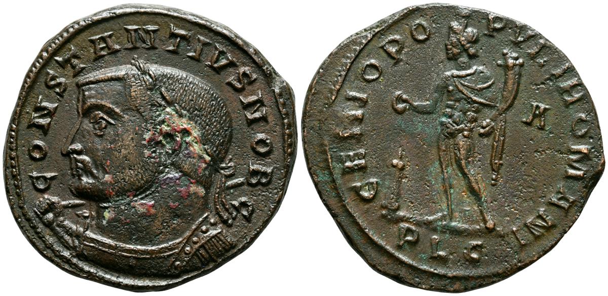 CONSTANCIO I. Follis. (Ae. 10,19g/29mm). 301-303 d.C. Lugdunum. (RIC 167a). Anv: Busto laureado y don coraza de Constancio I a izquierda portando cetro, alrededor leyenda: CONSTANTIVS NOB. Rev: Genio estante a izquierda portando patera sobre altar y cornucopia, en campo: A, en exergo: PLC, alrededor leyenda: GENIO POPVLI ROMANI. MBC+. Bonito y escaso ejemplar.