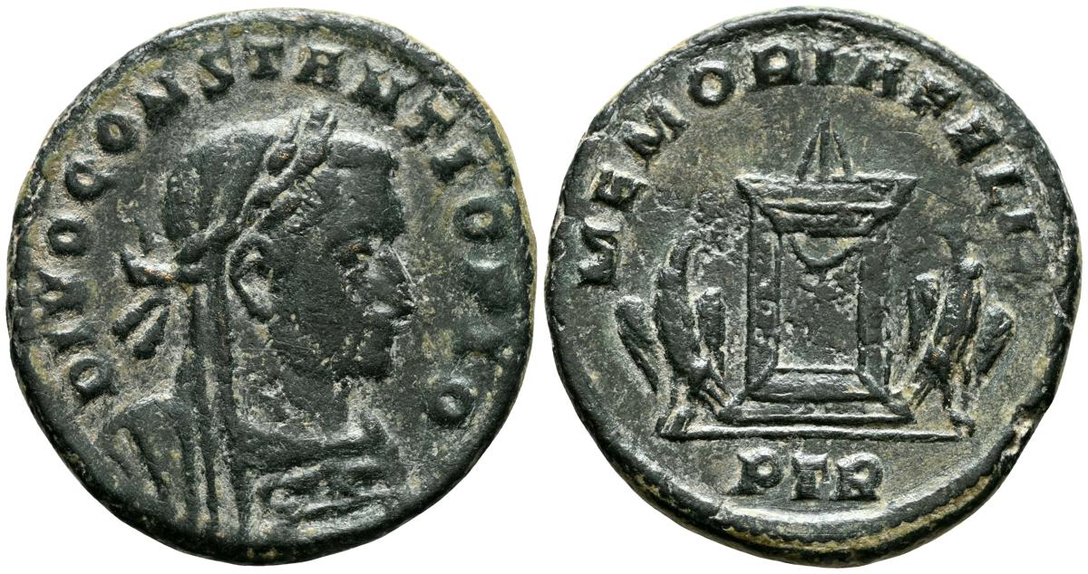 CONSTANCIO I. Follis. (Ae. 6,30g/25mm). 307-308 d.C. Treveri. (RIC 789). Anv: Busto laureado, velado y drapeado con coraza de Constancio I a derecha, alrededor leyenda: DIVO CONSTANTIO PIO. Rev: Altar encendido, entre dos águilas, en exergo: PTR, alrededor leyenda: MEMORIA FELIX. MBC.