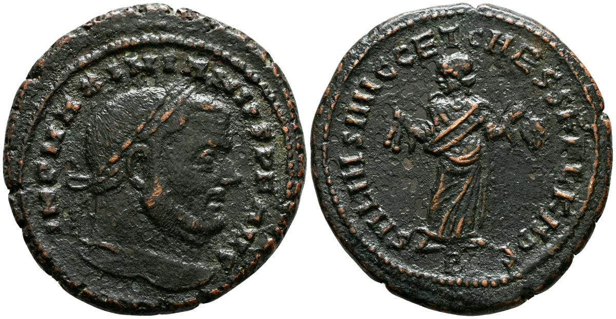 MAXIMIANO HERCULEO. Follis. (Ae. 9,69g/30mm). 300-301 d.C. Roma. (RIC 100b). Anv: Busto laureado de Maximiano Herculéo a derecha, alrededor leyenda: IMP C MAXIMIANVS P F AVG. Rev: Moneta estante a izquierda portando escalas y cornucopia, en exergo: S-mazo, alrededor leyenda: SACRA MON VRB AVGG ET CAESS N N. MBC.