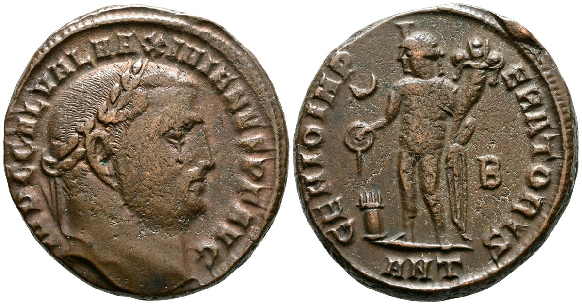 MAXIMINO II. Follis. (Ar. 4,38g/21mm). 310-313 d.C. Antioquía. (RIC 169b). Anv: Cabeza laureada de Maximino II a la derecha, alrededor leyenda: GAL VAL MAXIMINVS NOB CAES. Rev: Virtus avanzando a derecha portando lanza, trofeo y arrastrando cautivo, en campo: estrella-I, en exergo: ANT, alrededor leyenda: VIRTVS EXERCITVS. MBC-.