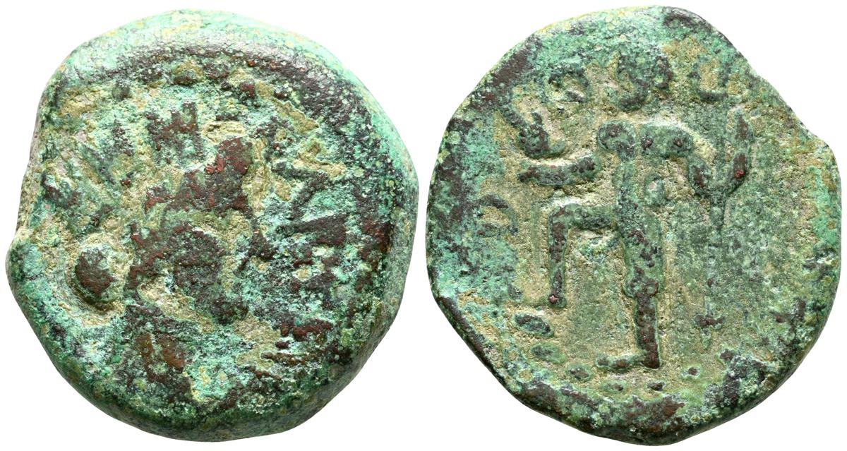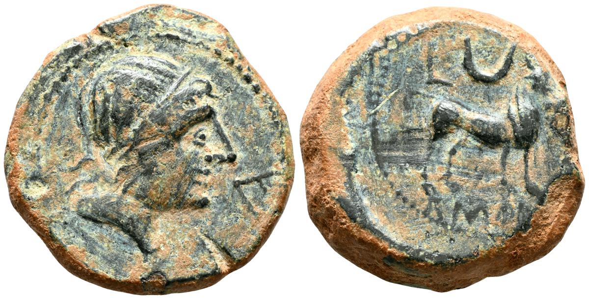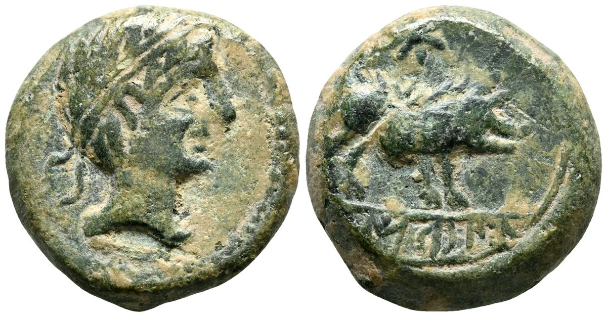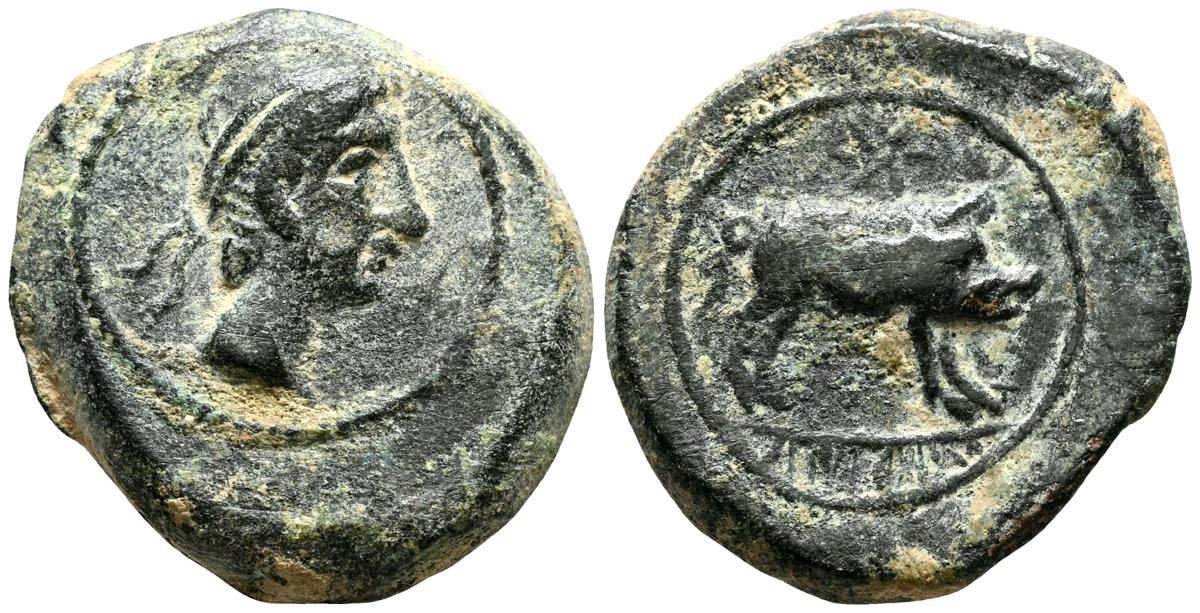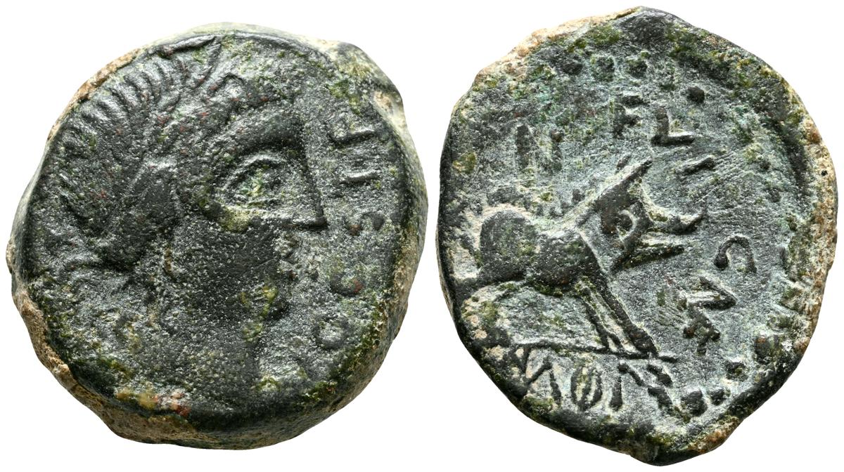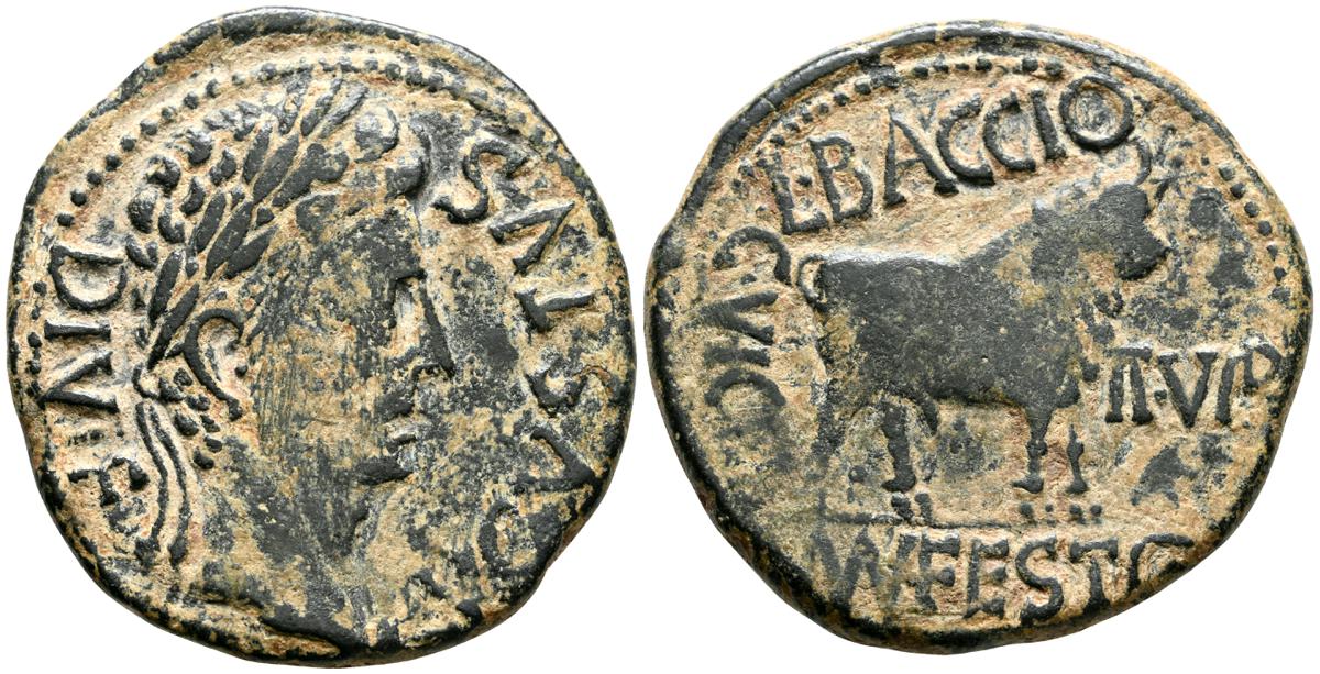 CELSE (Velilla del Ebro, Zaragoza). As. (Ae. 14,16g/28mm). 14-36 d.C. (FAB-819). Anv: Cabeza laureada de Tiberio a derecha, alrededor leyenda: TI CAESAR AVGVSTVS. Rev: Toro a derecha, encima leyenda: BACC FRONT, debajo: CN BVCCO, a la izquierda: D V I CEL, a la derecha: II VIR II. MBC+. Repasado.