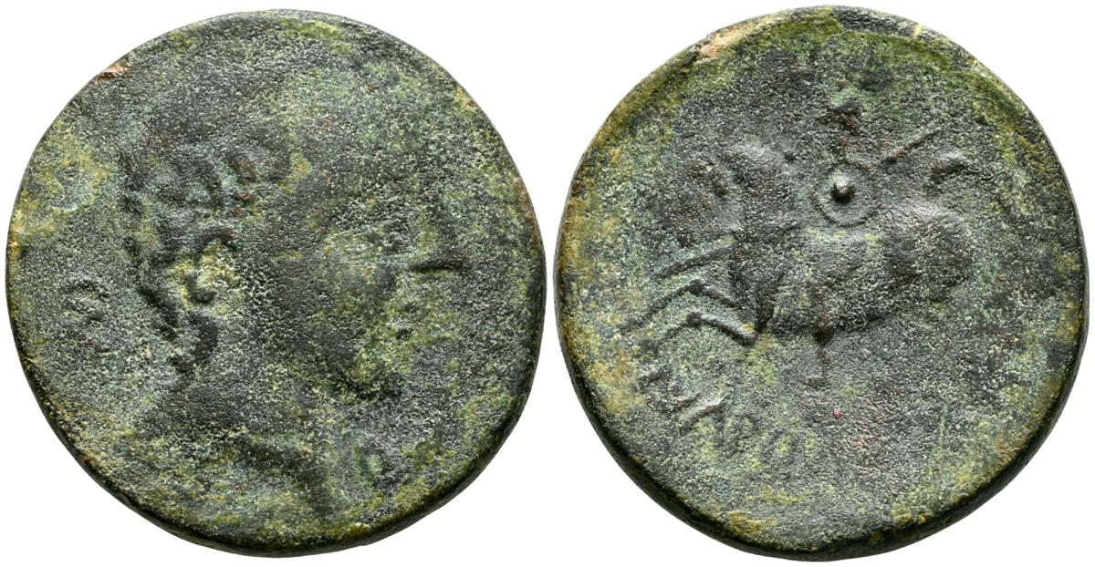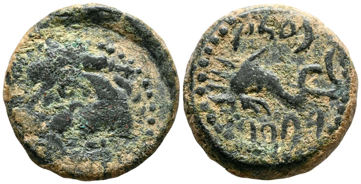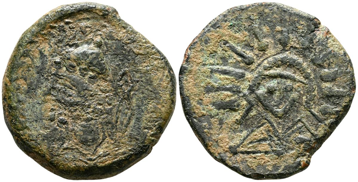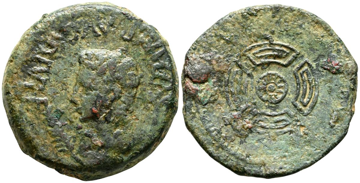 OBULCO (Porcuna, Jaén). As. (Ae. 17,84g/29mm). 220-20 d.C. (FAB-1815). Anv: Cabeza femenina a derecha, delante leyenda externa: OBVLCO, detrás creciente y letra ibérica Ta. Rev: Arado a derecha, debajo espiga a izquierda, entre ellos leyenda: L AIMIL/ M IVNI/ AID. MBC-.