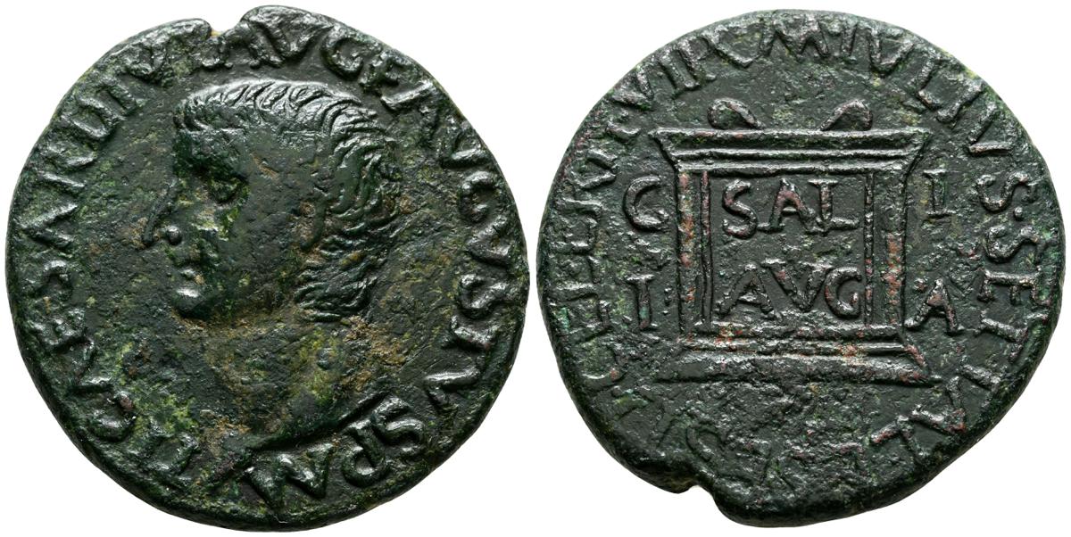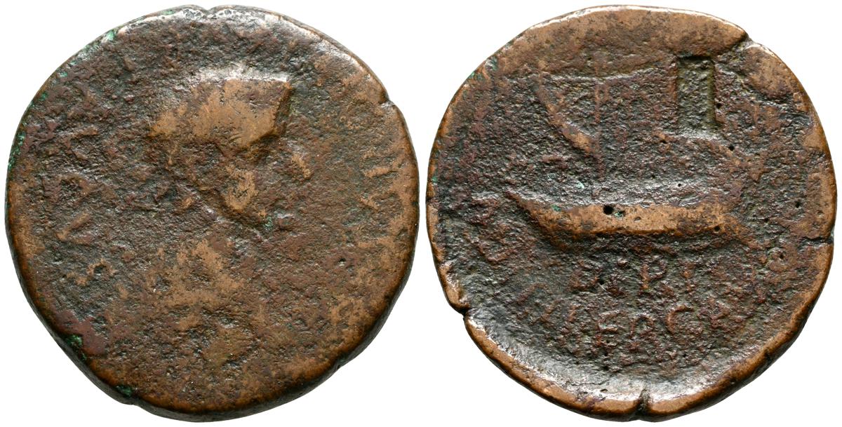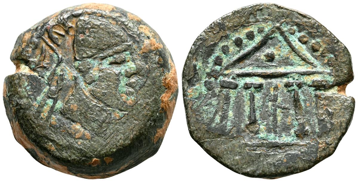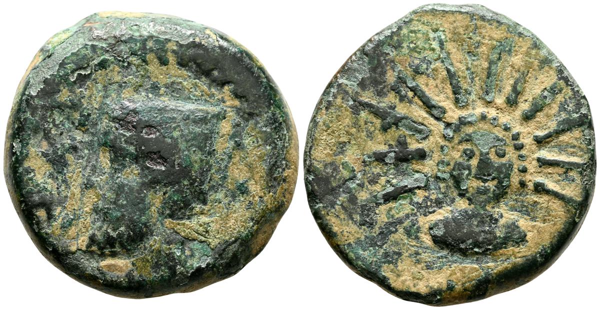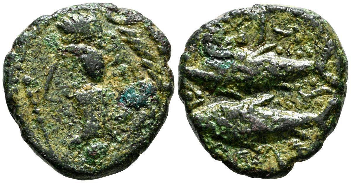 OBULCO (Porcuna, Jaén). As. (Ae. 17,84g/29mm). 220-20 d.C. (FAB-1815). Anv: Cabeza femenina a derecha, delante leyenda externa: OBVLCO, detrás creciente y letra ibérica Ta. Rev: Arado a derecha, debajo espiga a izquierda, entre ellos leyenda: L AIMIL/ M IVNI/ AID. MBC-.