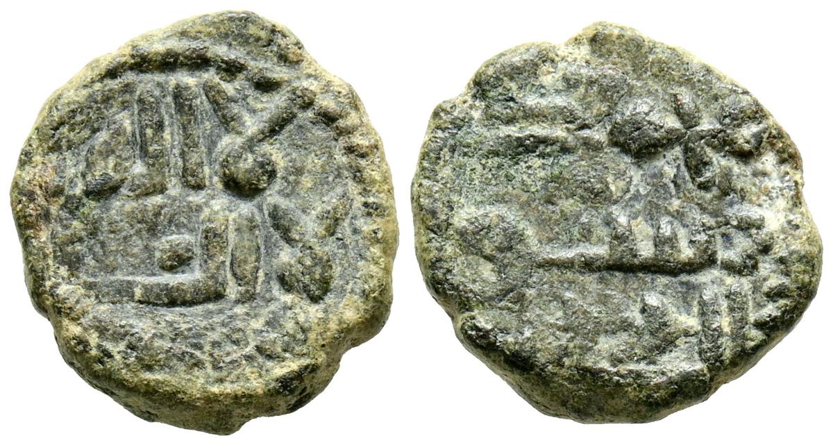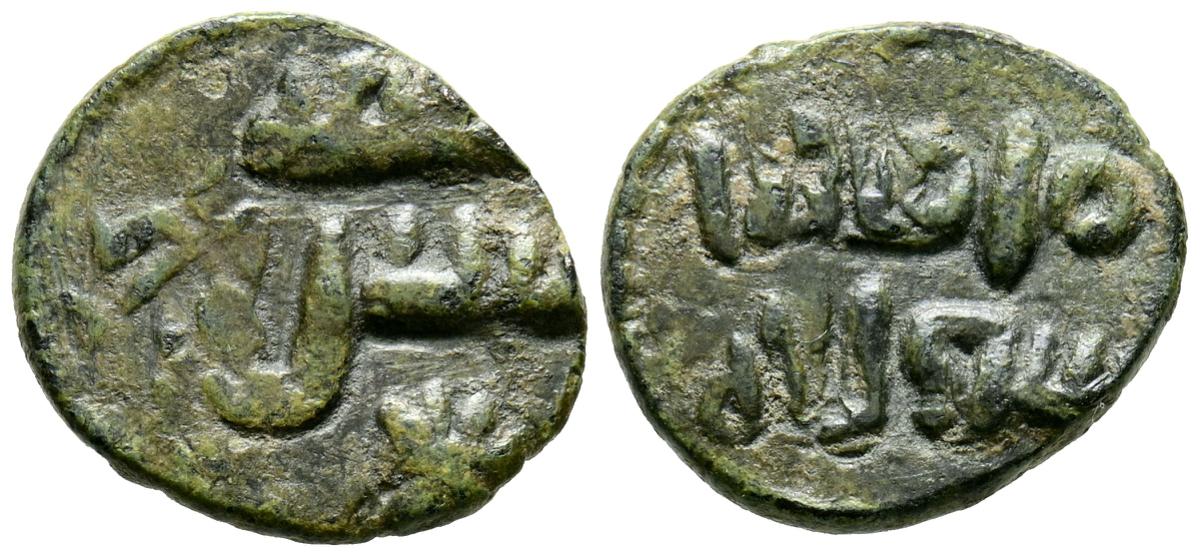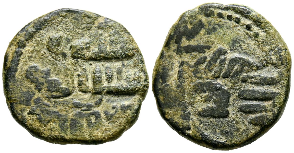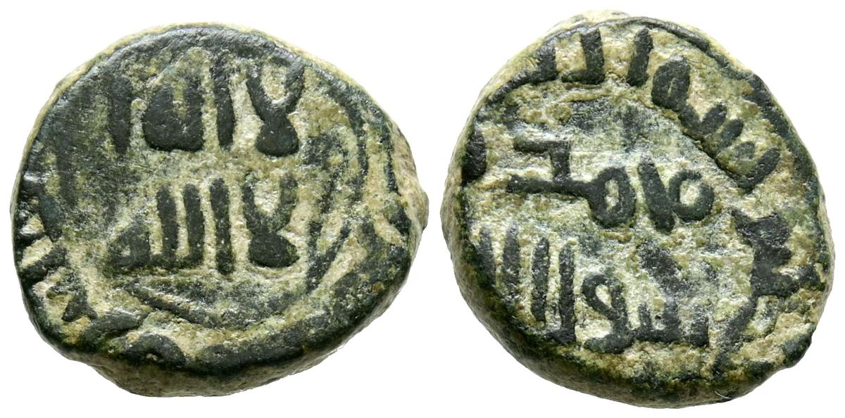 EMIRATO DEPENDIENTE DE CÓRDOBA, PERIODO DE GOBERNADORES. Anónimo. Felús. (Ae. 3,71g/16mm). ¿125H? al-Ándalus / الاندلس. (Frochoso XX-b). Anv: لا شرك له / الله وحده / لا اله الا. Rev: لم يولد / الله أزلي / الله واحد. (Dios es uno / Dios es eterno / Y no fue engendrado). Gran parte de las orlas visible en ambas áreas. MBC+. Interesante ejemplar.