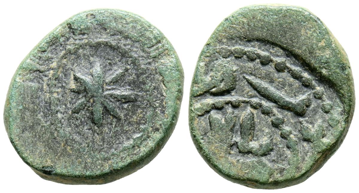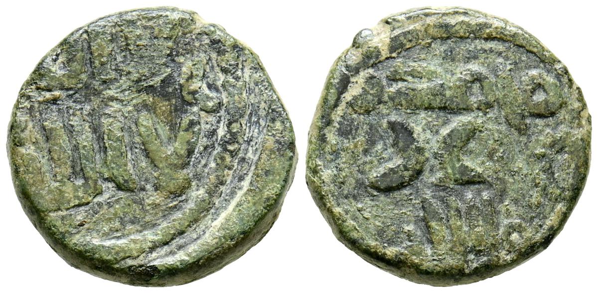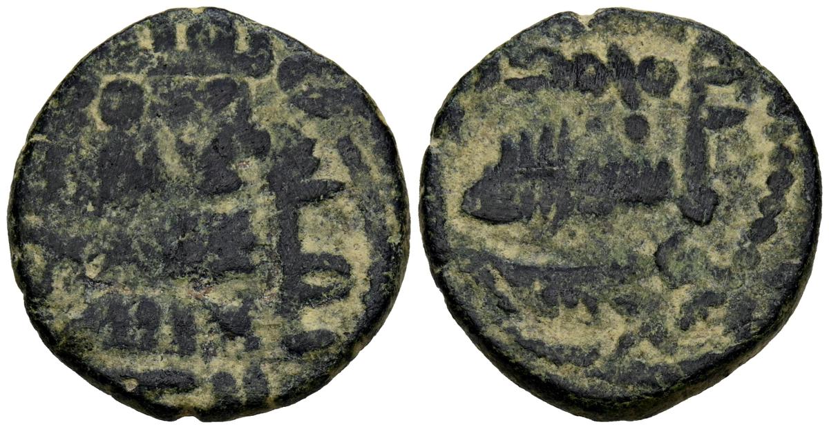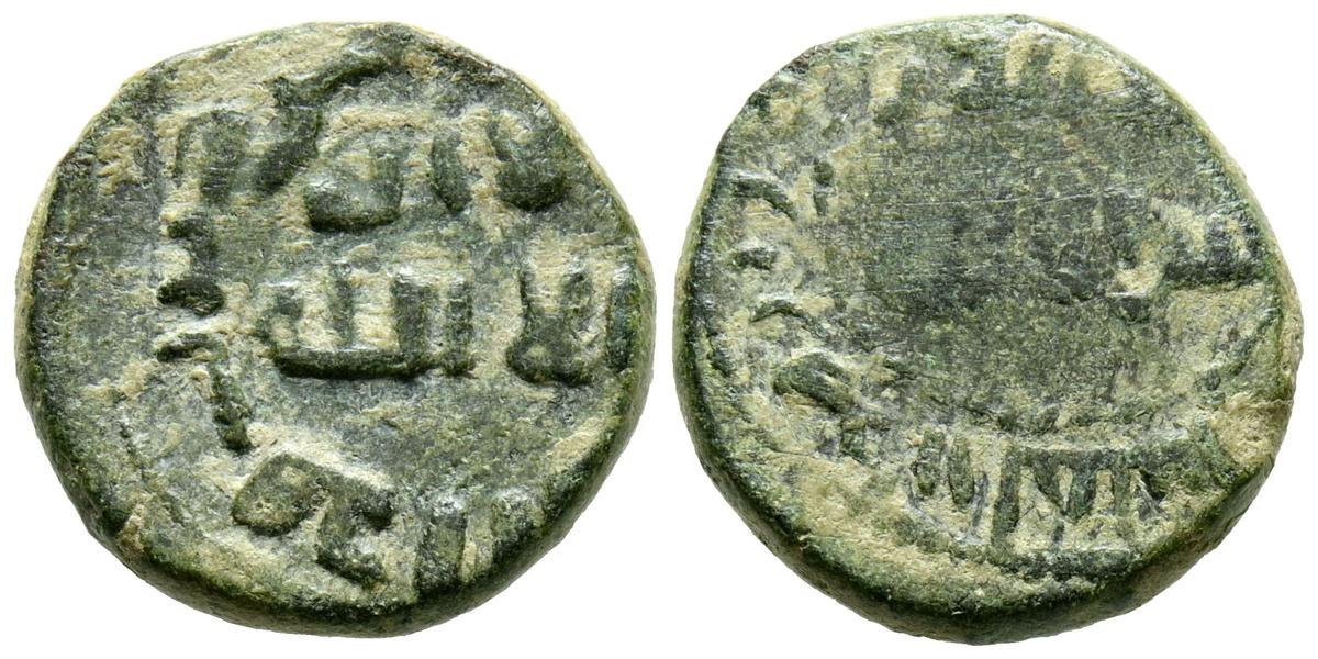 EMIRATO DEPENDIENTE DE CÓRDOBA, PERIODO DE GOBERNADORES. Anónimo. Felús. (Ae. 1,08g/12mm). S/D. (Frochoso XIV-a; Walker-Th12). Anv: 'Sahada' en tres líneas rodeada de una gráfila de hojas. Rev: Cabeza de guerrero a derecha, alrededor misión porfética de Muhammad. EBC-. Extraordinario ejemplar.