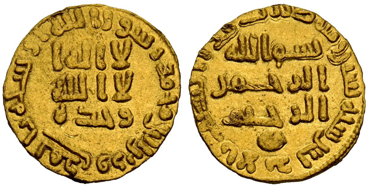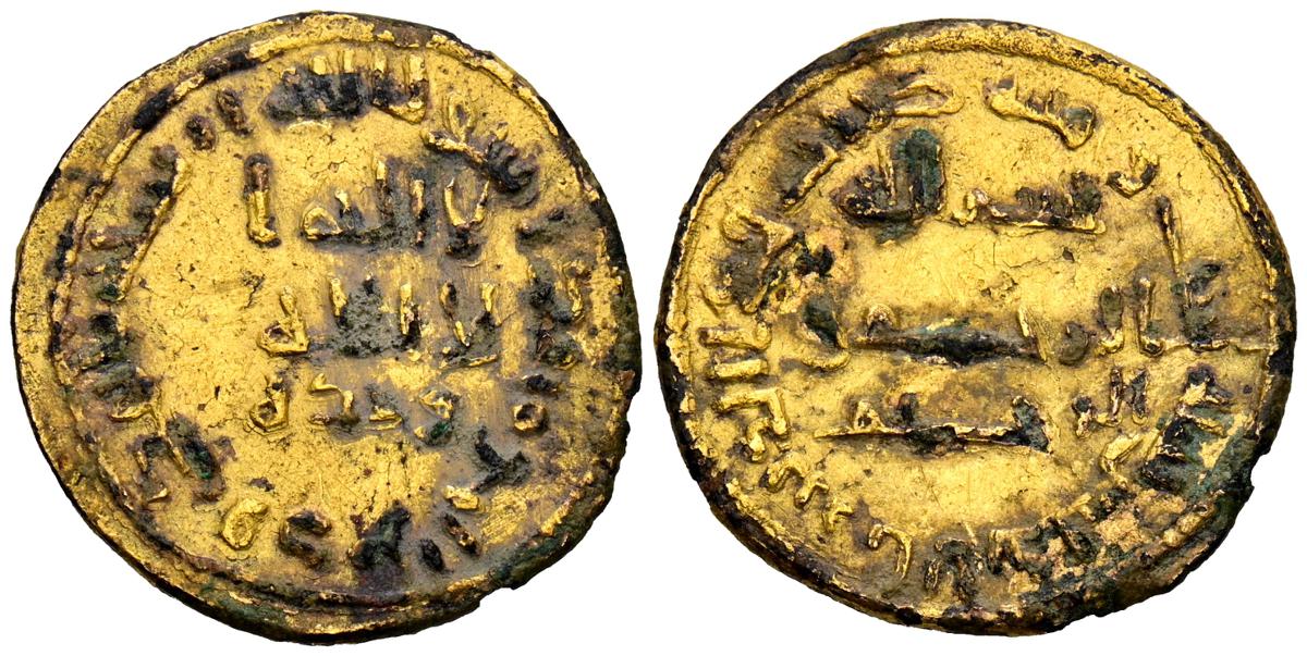 EMIRATO DEPENDIENTE DE CÓRDOBA, PERIODO DE GOBERNADORES. Anónimo. 1/2 Dinar. (Au. 2,14g/14mm). 102H. al-Andalus / الاندلس. (Vives 15; Album 134C). Con el valor expresado: النصف / "al-nisf" (medio). EBC. Leves rozaduras tanto en anverso como en revers o. Extremadamente raro, tenemos constancia de otros cinco ejemplar: Uno en la colección de la Bibliothèque Nationale de París, otro en la colección de la Hispanic Society of America, el recogido en el catálogo: "Láminas Inéditas de D. Antonio Delgado " (lámina I, nº 10) y como comenta Aureo & Calicó en la Colección Tonegawa Vol.II, nº Lote 4, en la página web de la colección aparece representado otro además del ofrecido en la subasta, el cual se adjudicó por 25.000€ más su respectiva comisión. A este reducida serie se suma ahora este nuevo ejemplar, cuyo excelente estado de conservación y clara impronta epigráfica aportan valiosa evidencia para la comprensión de las emisiones andalusíes tempranas. Su aparición no solo amplía el corpus conoci do, sino que también ofrece un testimonio material del alcance y continuidad de la reforma monetaria omeya en el extremo occidental del Dār al-Islām.
