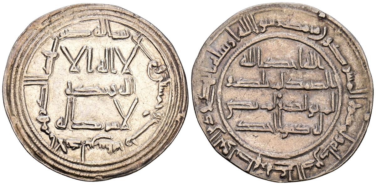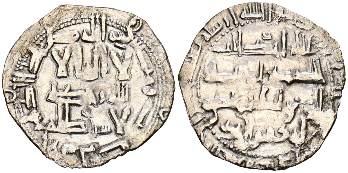EMIRATO DEPENDIENTE DE CÓRDOBA, PERIODO DE GOBERNADORES. Anónimo. Dirham. (Ar. 2,66g/28mm). 136H. al-Ándalus / الاندلس. (Vives no cita; Walker no cita; Klar no cita; Martín Escudero (2005) p. 90; Frochoso 136.1). EBC. Cospel faltado sin afectar a las leyendas. Rarísimo ejemplar.