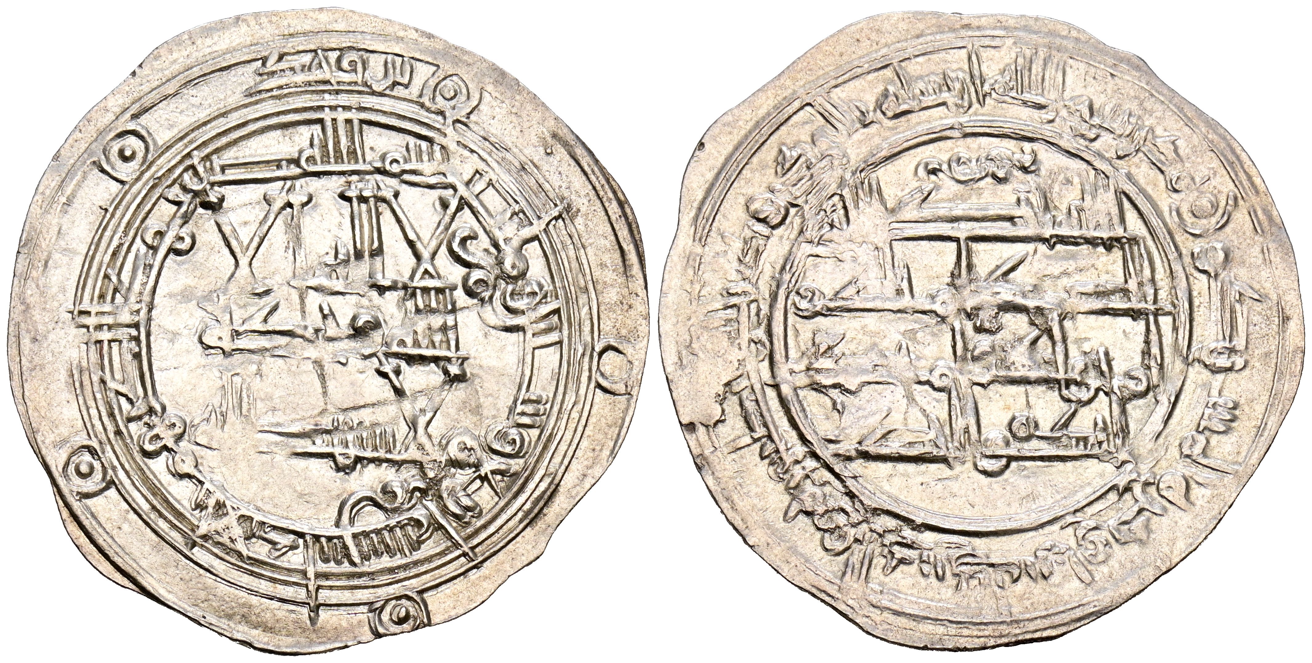 EMIRATO DEPENDIENTE DE CÓRDOBA. Muhammad I. Dirham. (Ar. 2,68g/31mm). 264H. al-Ándalus / الاندلس. (Vives 295; Frochoso 264.10). Citando a Ibn Fahad / بن فهد entre gráfilas en anverso. SC.
