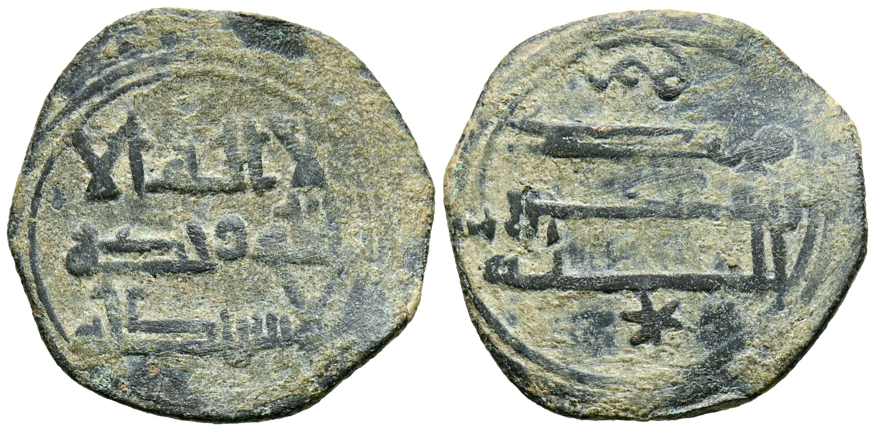 EMIRATO INDEPENDIENTE DE CÓRDOBA. Anónimo, atribuído a Muhammad l. Felús. (Ae. 1,70g/20mm). S/D. (Frochoso l-42). Tres líneas de leyenda religiosa en ambas áreas. MBC.