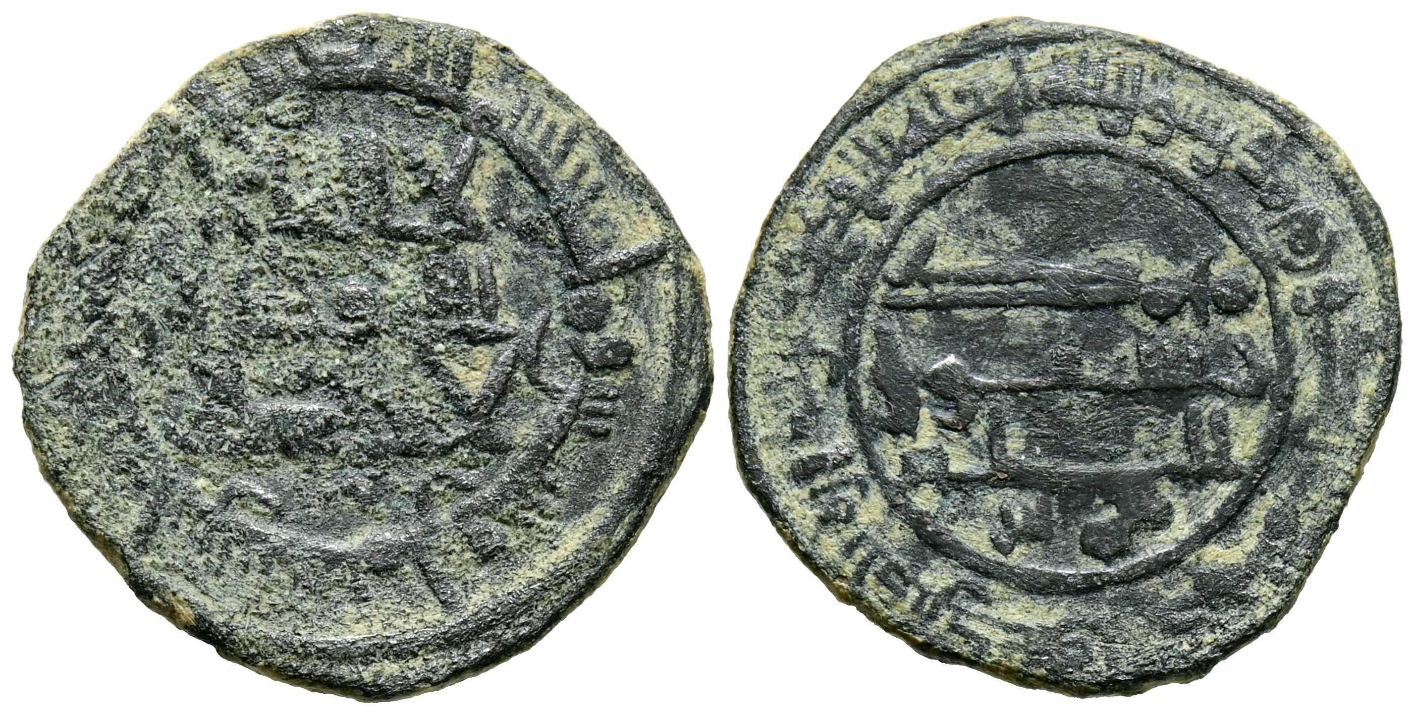 EMIRATO INDEPENDIENTE DE CÓRDOBA. Atribuído a Muhammad I. Felús. (Ae. 1,86g/19mm). 268H. al-Ándalus /الاندلس. (Vives 313; Miles 161 v; Frochoso I-23). Variante con nombre indeterminado en IIA. MBC. Escasa.