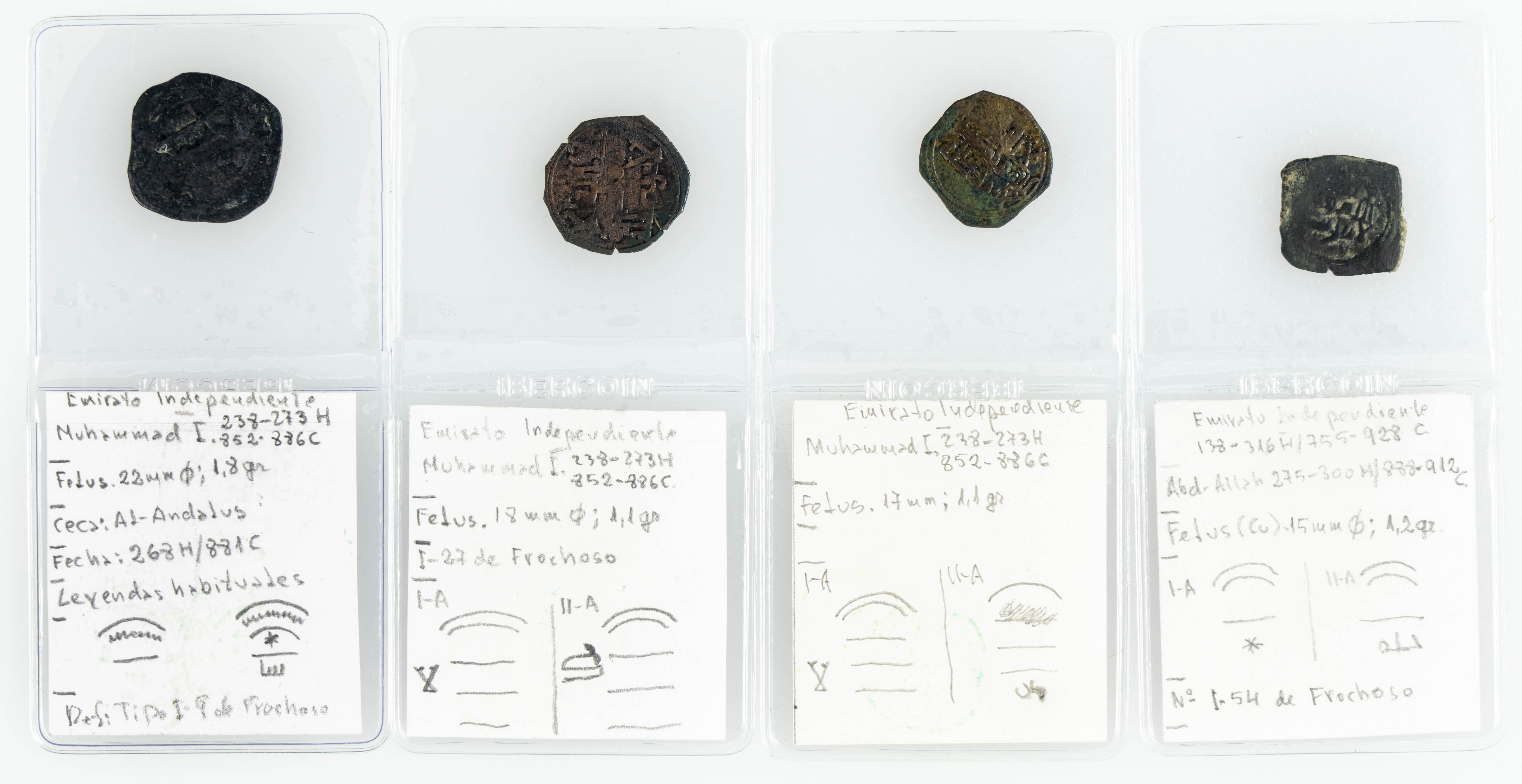 EMIRATO INDEPENDIENTE DE CÓRDOBA. Interesante conjunto formado por 4 feluses acuñados durante los mandatos de Abd al-Rahman II, Muhammad I y Adb Allah. Pertenecientes a una colección antigua, cada una de las piezas se acompaña de un pequeño cartón co n una minuciosa descripción. Diferentes medidas y estados de conservación. A EXAMINAR.