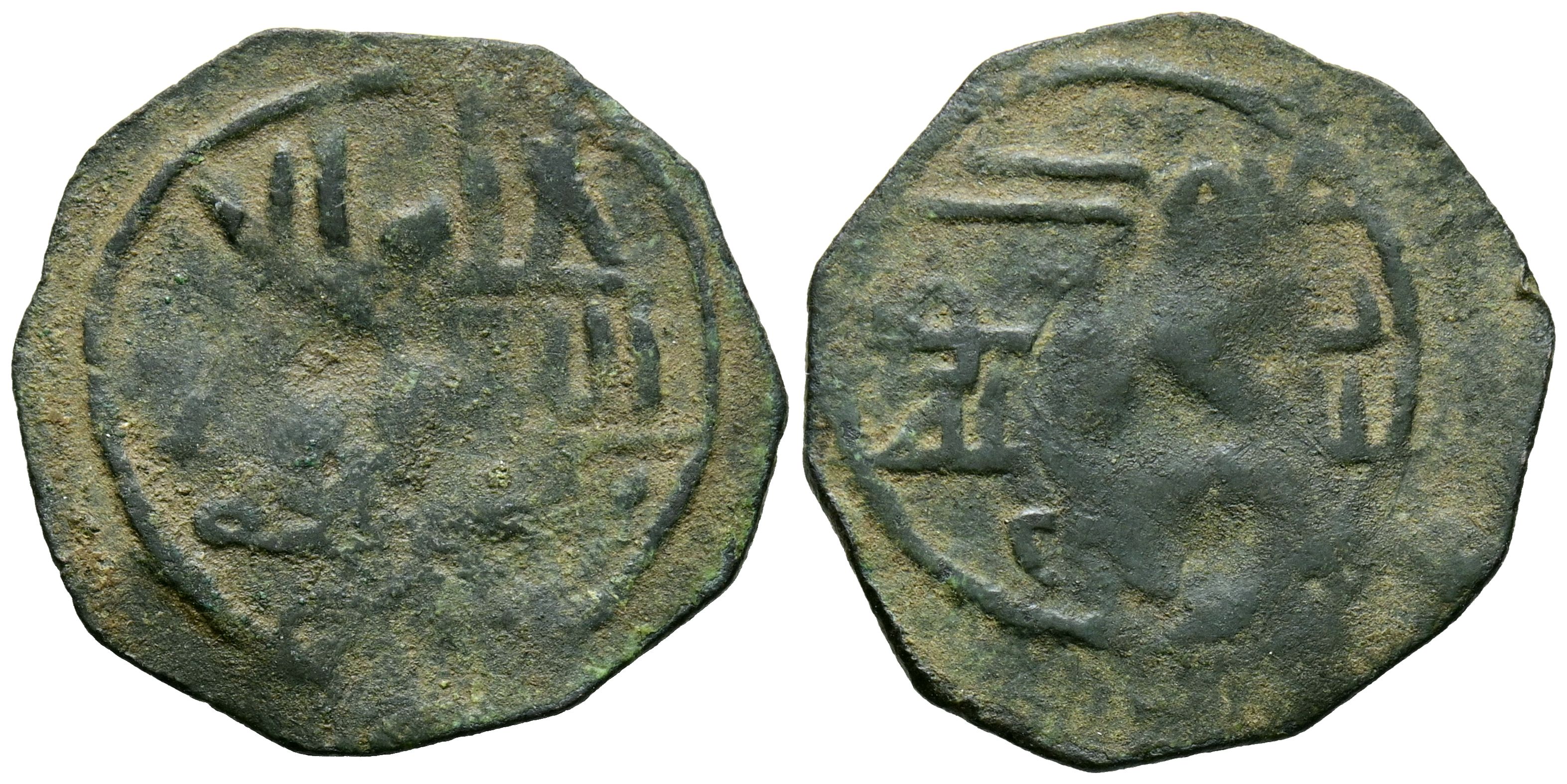 EMIRATO DEPENDIENTE DE CÓRDOBA, PERIODO DE GOBERNADORES. Anónimo. Felús imitativo. (Ae. 1,75g/22mm). S/D. (Similar a Rodríguez Pérez nº7, Manquso 2-pág. 11). Anv: لا شرك له / الله وحده / لا اله الا. Rev: الله/ رسول / محمد. MBC+. Muy raro e interesant e ejemplar.