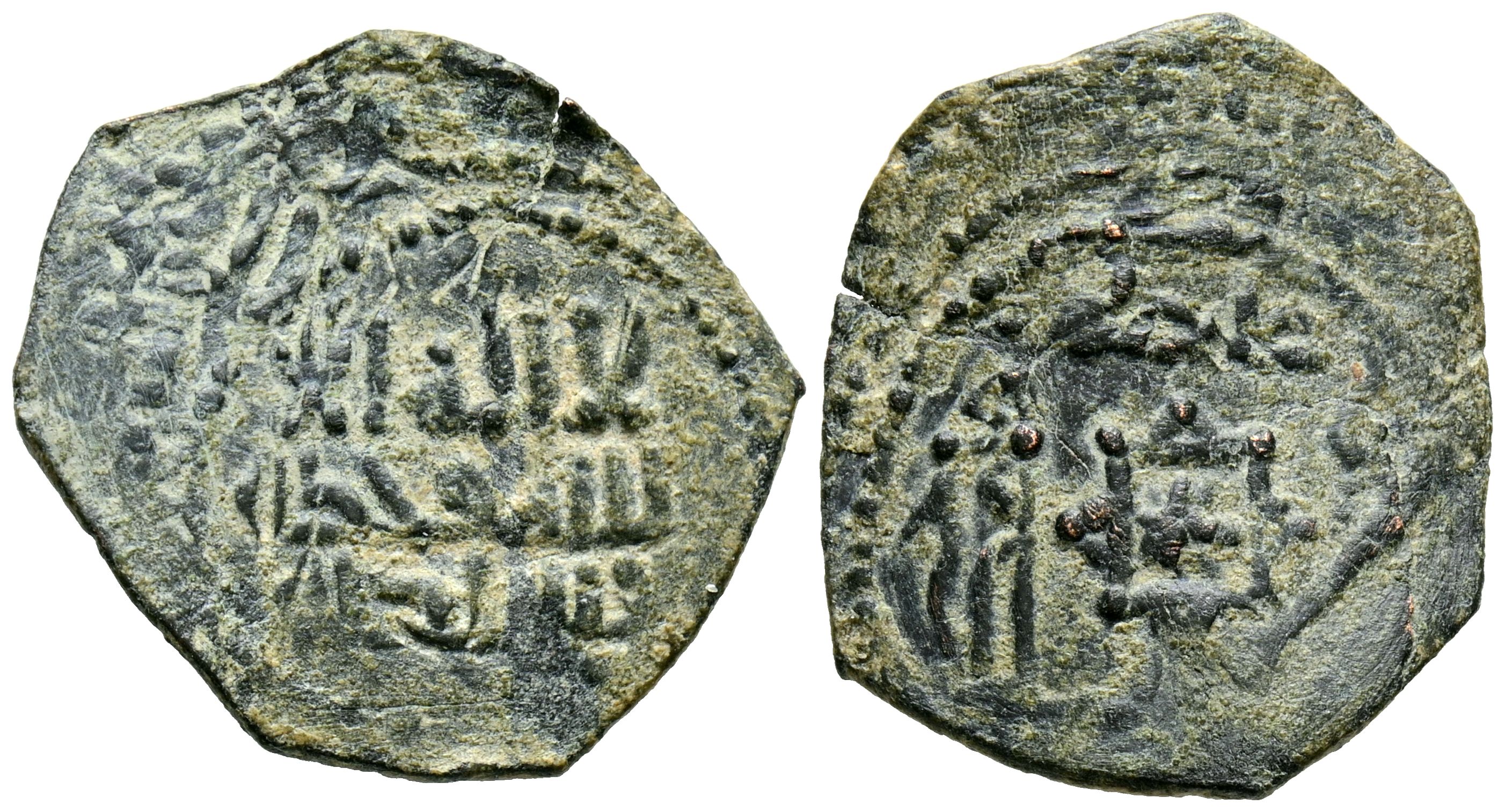 EMIRATO INDEPENDIENTE DE CÓRDOBA, atribuída a Abd Allah (275-300H). Felús. (Ae. 1,76g/21mm). S/D. (Vives 333; Frochoso I-72). Anv: 'Sahada' en tres líneas rodeada de triple gráfila circular de puntos. Rev: Sello de Salomón, alrededor leyenda en cuadr ado con la misión profética de Muhammad / محمد رسول الله y citando a Husain Ibn Isam / حسين بن عاصم. MBC. Cospel hexagonal y alabeado. Raro.