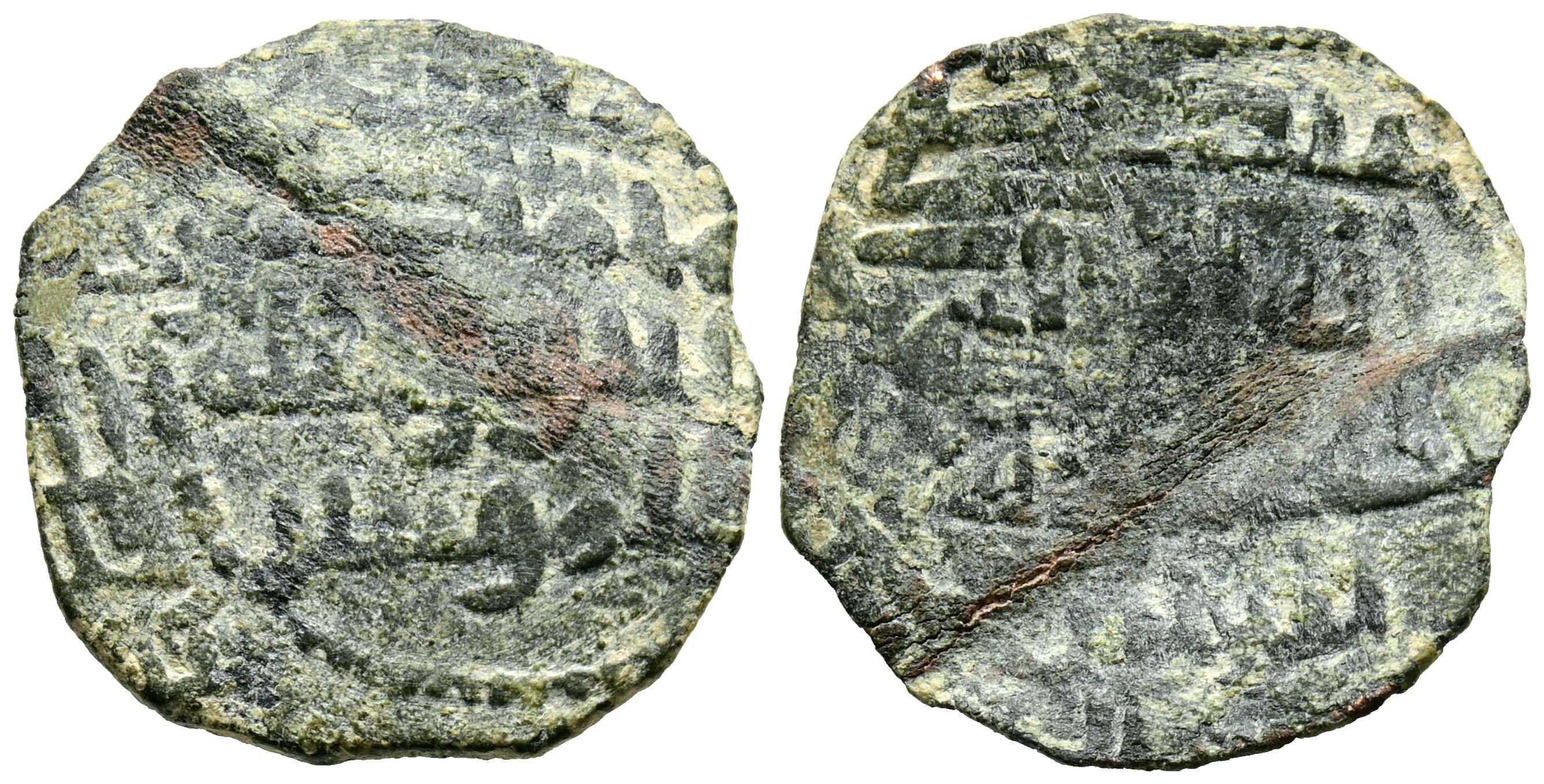 EMIRATO INDEPENDIENTE DE CÓRDOBA. Abd al-Rahman III. Felús. (Ae. 1,38g/19mm). Hacia 316-319H. (Frochoso I-97). Citando a Abd al-Rahman / الرحمن / عبد en IA. y el título de Amir al-Muminin / امير المومنين abajo en IIA. MBC-. Marca de doblez. Raro.