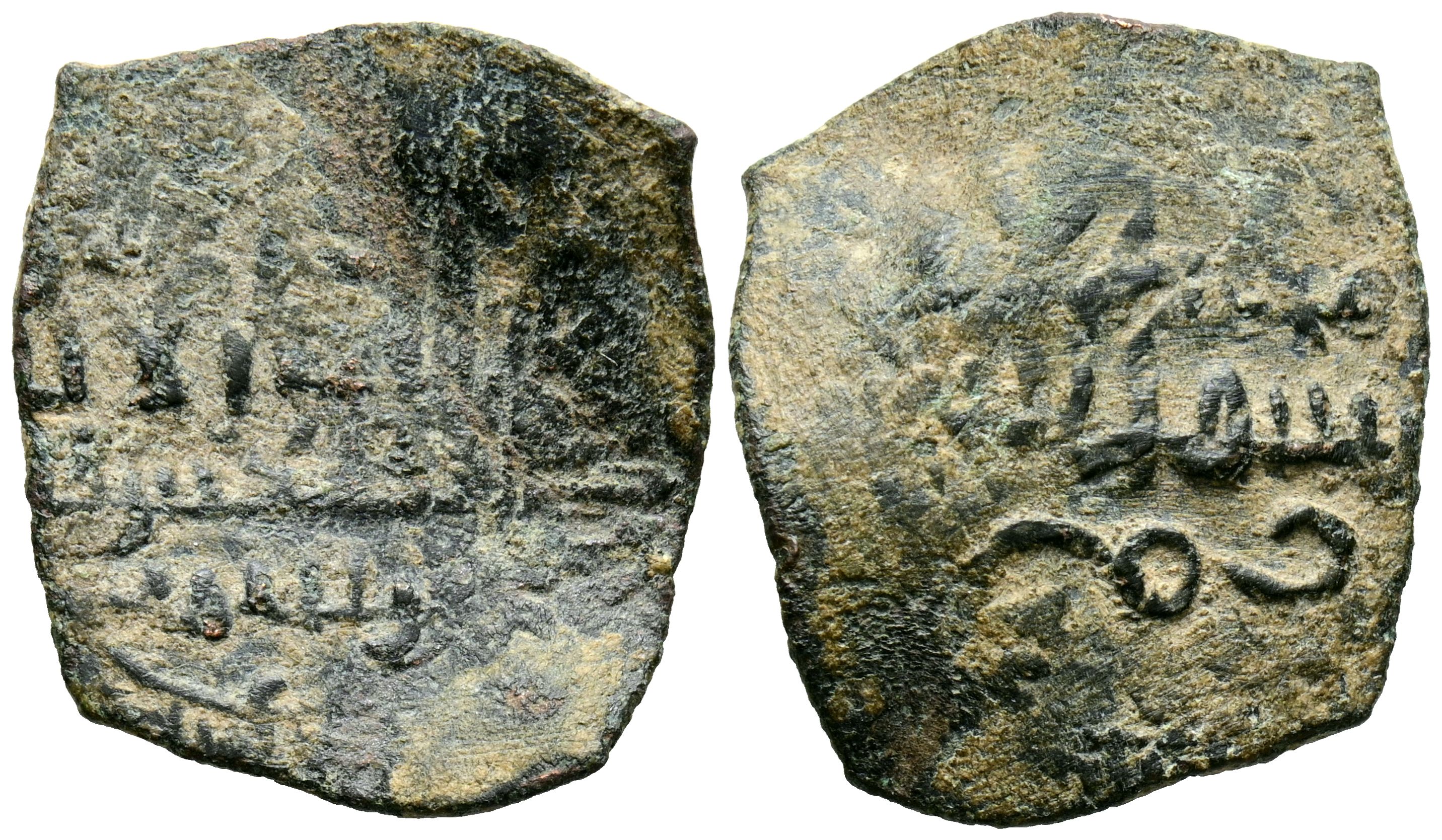 CALIFATO DE CÓRDOBA. Abd al-Rahman III. Felús. (Ae. 2,23g/23mm). 319-323H. (Vives 370; Frochoso I-92; Frochoso, Francés y Rodríguez (Manquso 19/2024) Tipo 39). Citando a Abd al-Rahman con título de Amir al-Muminin: امير المومنين / عبد الرحمن en IA. y a Yahya Ibn Yunus / يحيى عبده en IIA. MBC-. Alabeada. Raro.