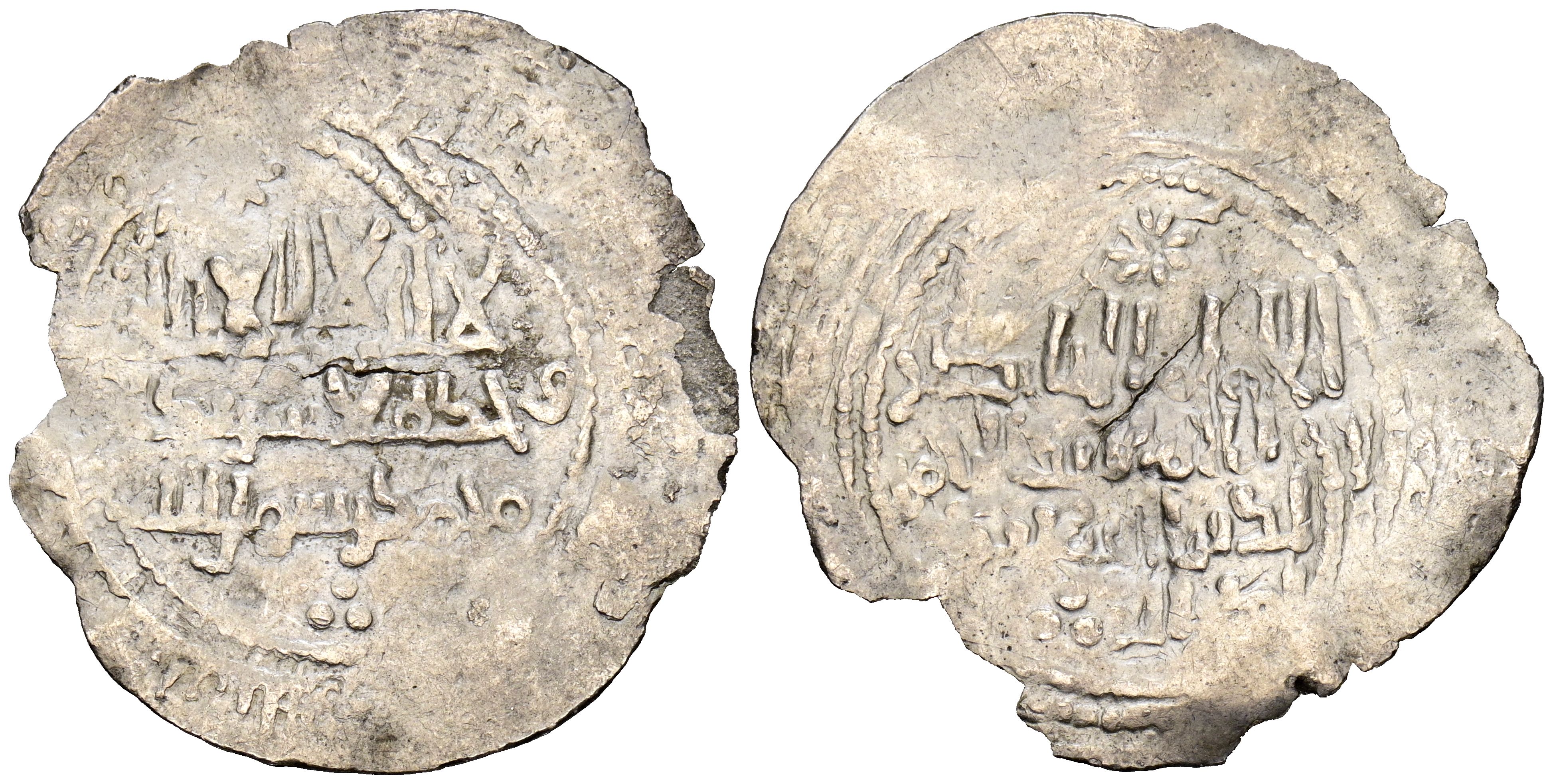 CALIFATO DE CORDOBA, Abd al-Rahman III. Dirham. (Ar. 2,04g/28mm). ¿317H? al-Ándalus / الاندلس. (Vives 352; Frochoso 317.15-16). Orlas no visibles. MBC-. Cospel irregular y vanos de acuñación, aun así, interesantísimo y muy raro ejemplar.