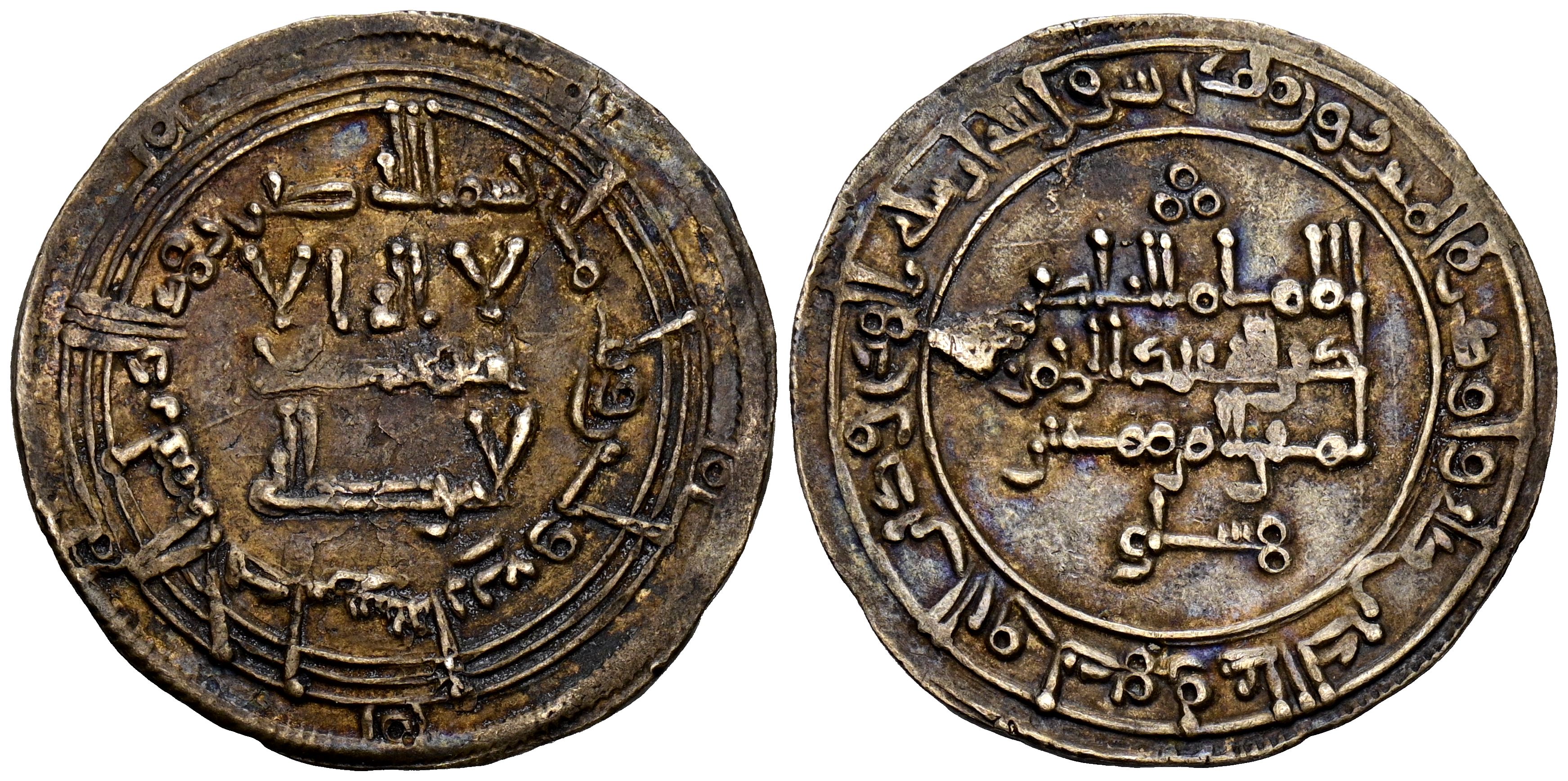 CALIFATO DE CÓRDOBA. 'Abd al-Rahman III. Dirham. (Ar. 3,31g/24mm). 334H. al-Ándalus / الاندلس. (Vives 407; Frochoso 334.10). Citando a Hisam / حشام en IIA. EBC-. Precioso ejemplar con tono dorado y destellos azulados.