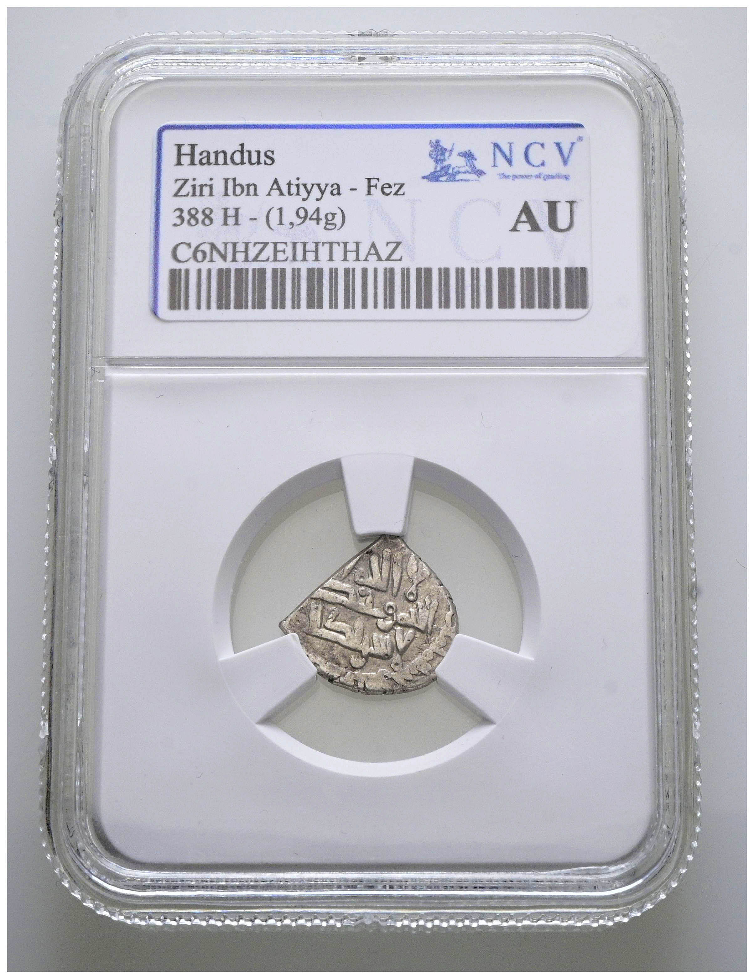 CALIFATO DE CÓRDOBA, Hisam II y el gobernador Ziri Ibn 'Atiyya. Handús. (Ar. 1,94g/14mm). 388H. Medina Fez. (Vives tipo 618; Francés, Manquso nº15, p. 63-66, mismo ejemplar). Citando a Ziri / زيري en IIA. Encapsulado por NCV AU. Único ejemplar conoci do.Ziri ibn ʿAtiyya, fue un jefe bereber y caudillo que en sus últimos años apoyó al califa Hišām II contra el poder de Ibn Abi ʿAmir. Su nombre solo aparace en la monedas del año 388H, último año de su gobierno, pues se enfrentó en el Magreb pri mero a Wadih y después a ʿAbd al-Malik, hijo de Amir, quien lo aplastó en Yabal habib, provocando la dispersión de sus fuerzas.