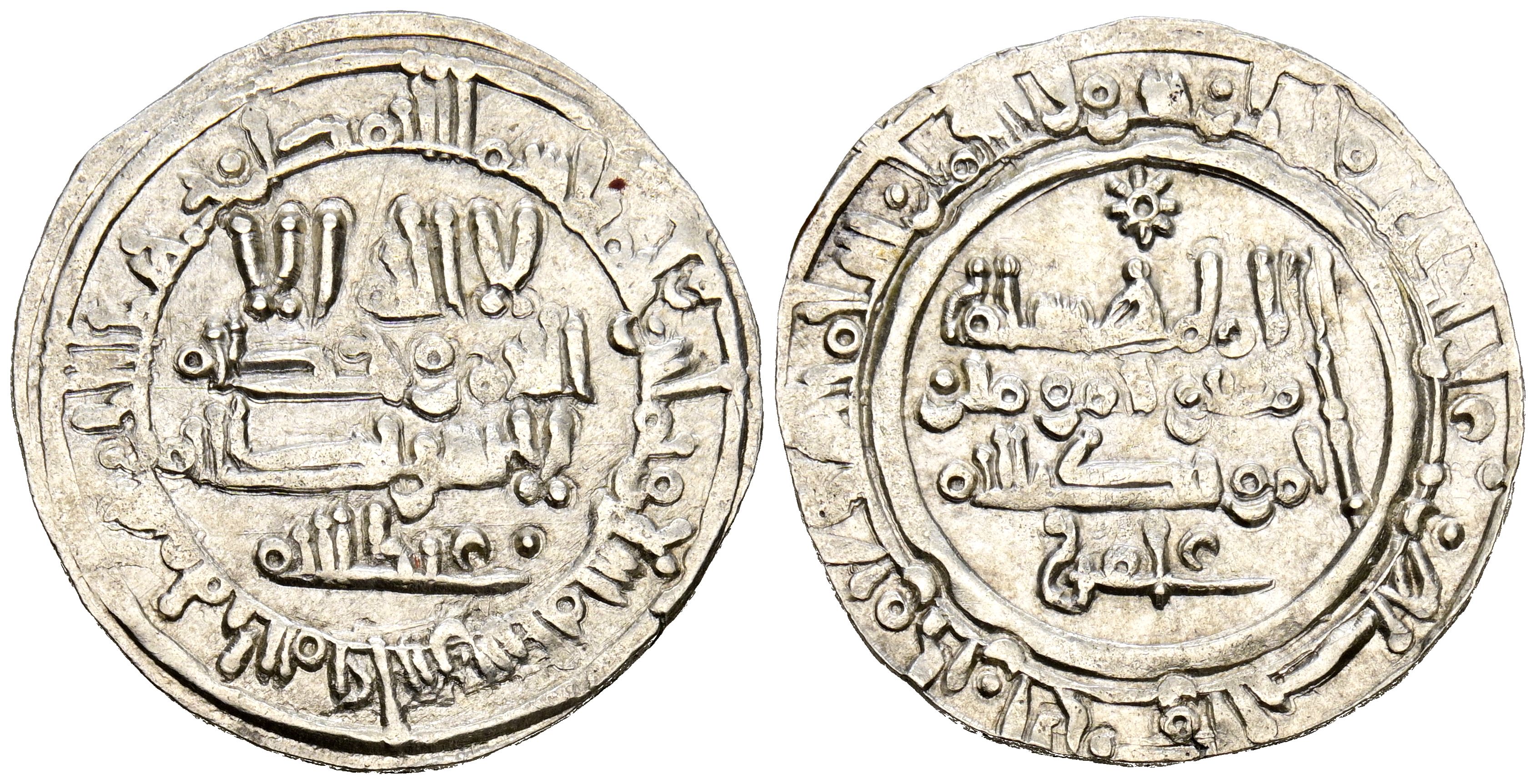 CALIFATO DE CORDOBA, Hisham II. Dirham. (Ar. 3,55g/24mm). 389H. Madinat Fas (Fez) / مدينة فاس. (Vives 622). Citando a 'Abd Allāh / عبداللة en IA. y 'Āmir / عامر en IIA. MBC+. Acuñación muy cuidada para esta ceca. Extraordinario y muy raro ejemplar.