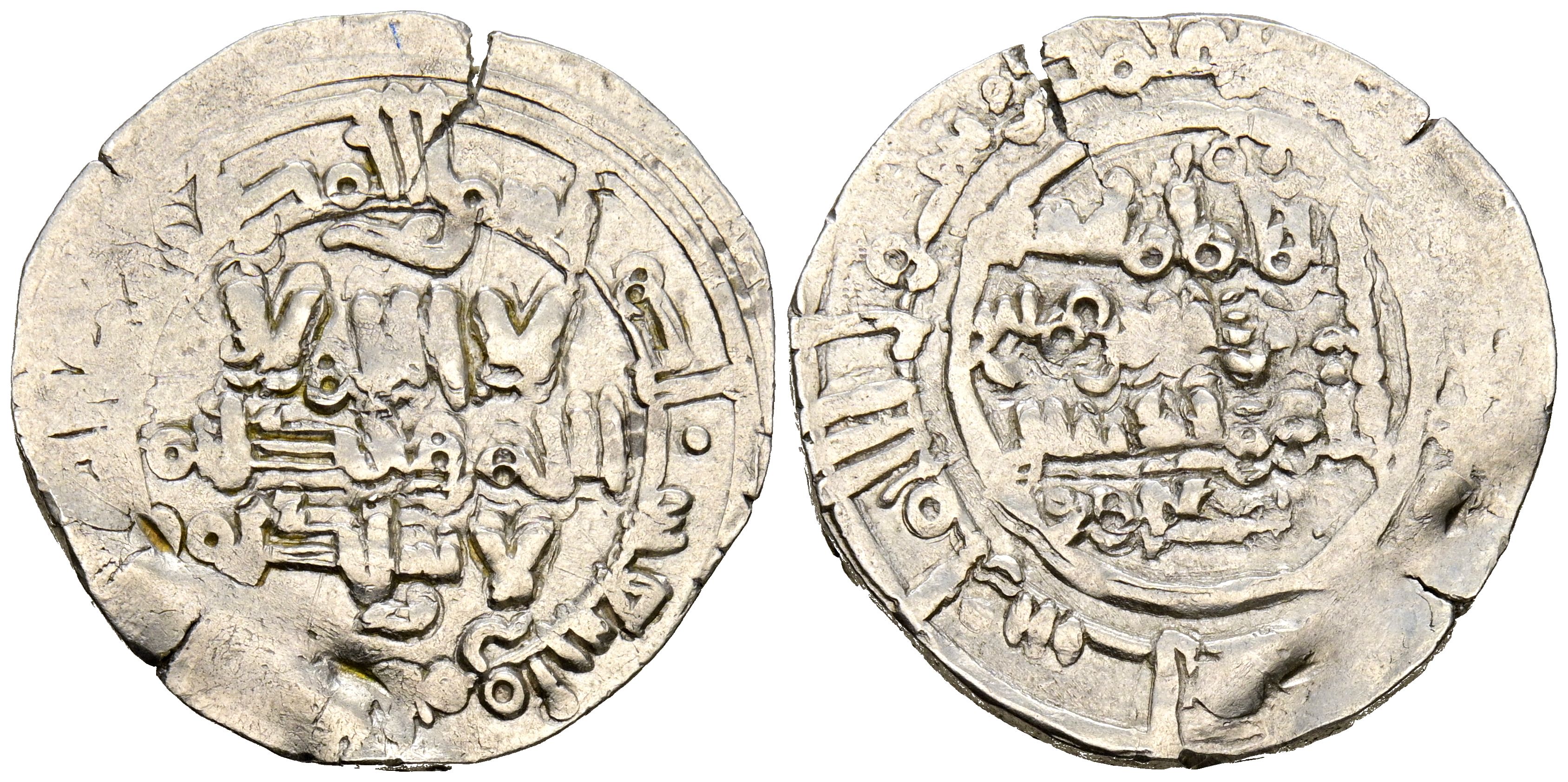 CALIFATO DE CÓRDOBA, Hisham II. Dirham. (Ar. 3,40g/24mm). 393H. Acuñación de estilo africano sin ceca. (Vives no cita). Citando a 'Āmir / عامر en IIA. y la unidad unidad de la fecha expresada en femenino ثلاثة (3). MBC. Vanos. Rara.