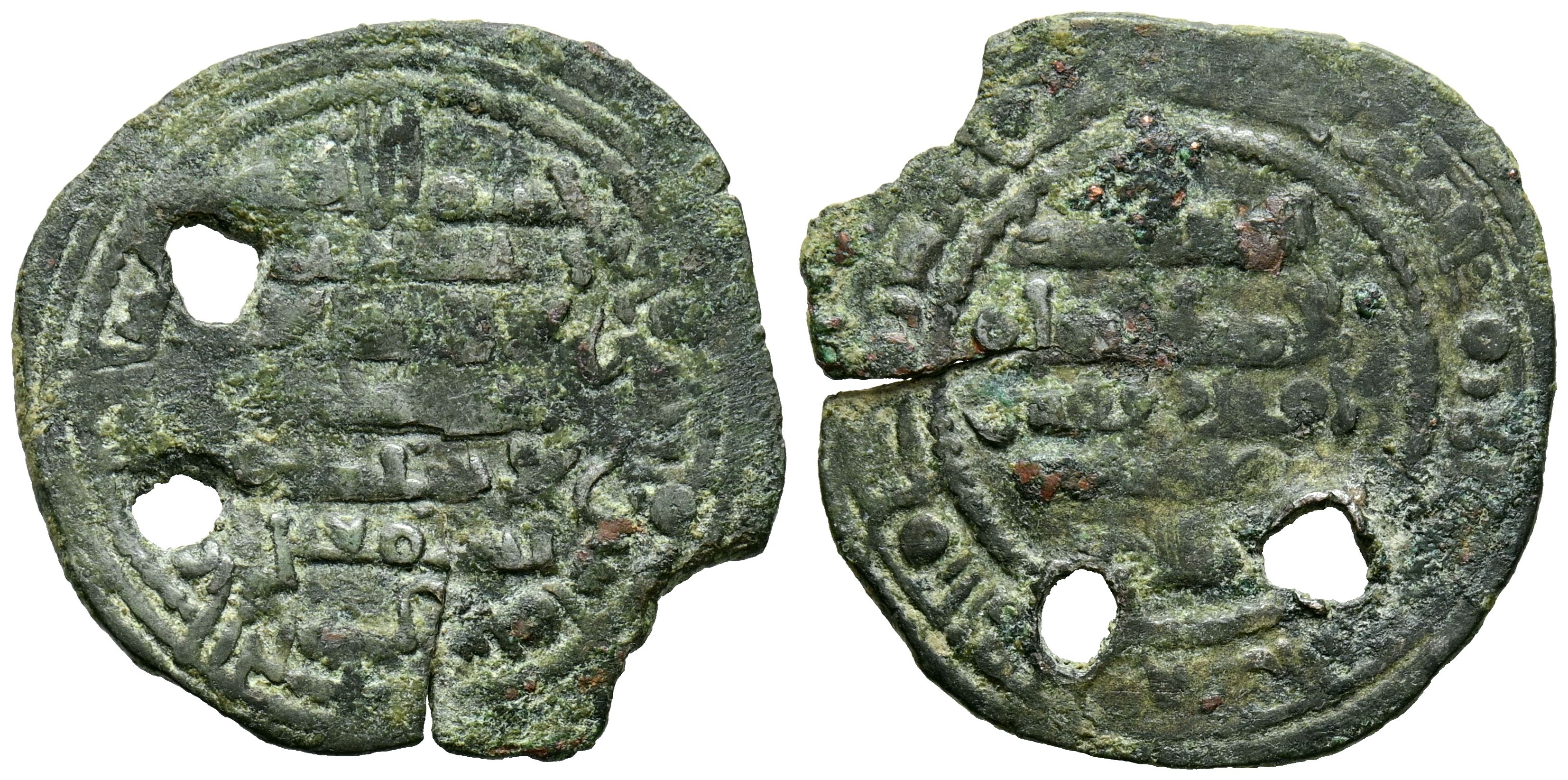 TAIFAS DEL CALIFATO, SEVILLA (Abbadíes). Abbad ibn Muhammad, al-Mu'tadid. Dirham. (Ve. 2,17g/24mm). 442H. al-Ándalus / الاندلس. (Vives 898; Prieto 397a). Citando al-hāyib Ismail: اسمعيل / الحاجب en IA. MBC-. Dos perforaciones. Rara.