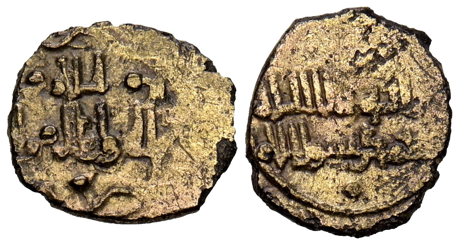 TAIFAS DEL CALIFATO, Anónimo atribuído a Toledo. Fracción de Dinar. (El. 0,54g/11mm). S/D. (Codera y Zaidin (1897) 1047 bis; Ibrahim, Cantó (2003) Suplemento a los Reinos de Taifas, nº 169, Francés nº362). Anuncio: لااله الاالله / محمدرسول الله. Rev: الح و ل و القوة / الله. (Para Dios / el poder y la fuerza). MBC-. Escasa.Codera atribuyó esta pieza a Almería ''por tener alguna semejanza con algunos ejemplares del nº 1047 de Vives, aunque en el tesorillo donde aparecieron aquellos ejemplares, también c ontenía otros diferentes de las taifas de Toledo, Badajoz, Córdoba, Valéncia, Dénia y Zaragoza. Sin embargo, precediendo la intuición del doctor Albert Cantó, sería David Francés quien daría un razonamiento más lógico a su origen, en su li bro ''De la legitimidad, las sucesiones y su reflejo en las acuñaciones andalusíes'' pág. 137-139, justificando la atribución de esta pieza a Toledo, durante la presencia de 'Umar al-Mutawakkil rey de Badajoz'.