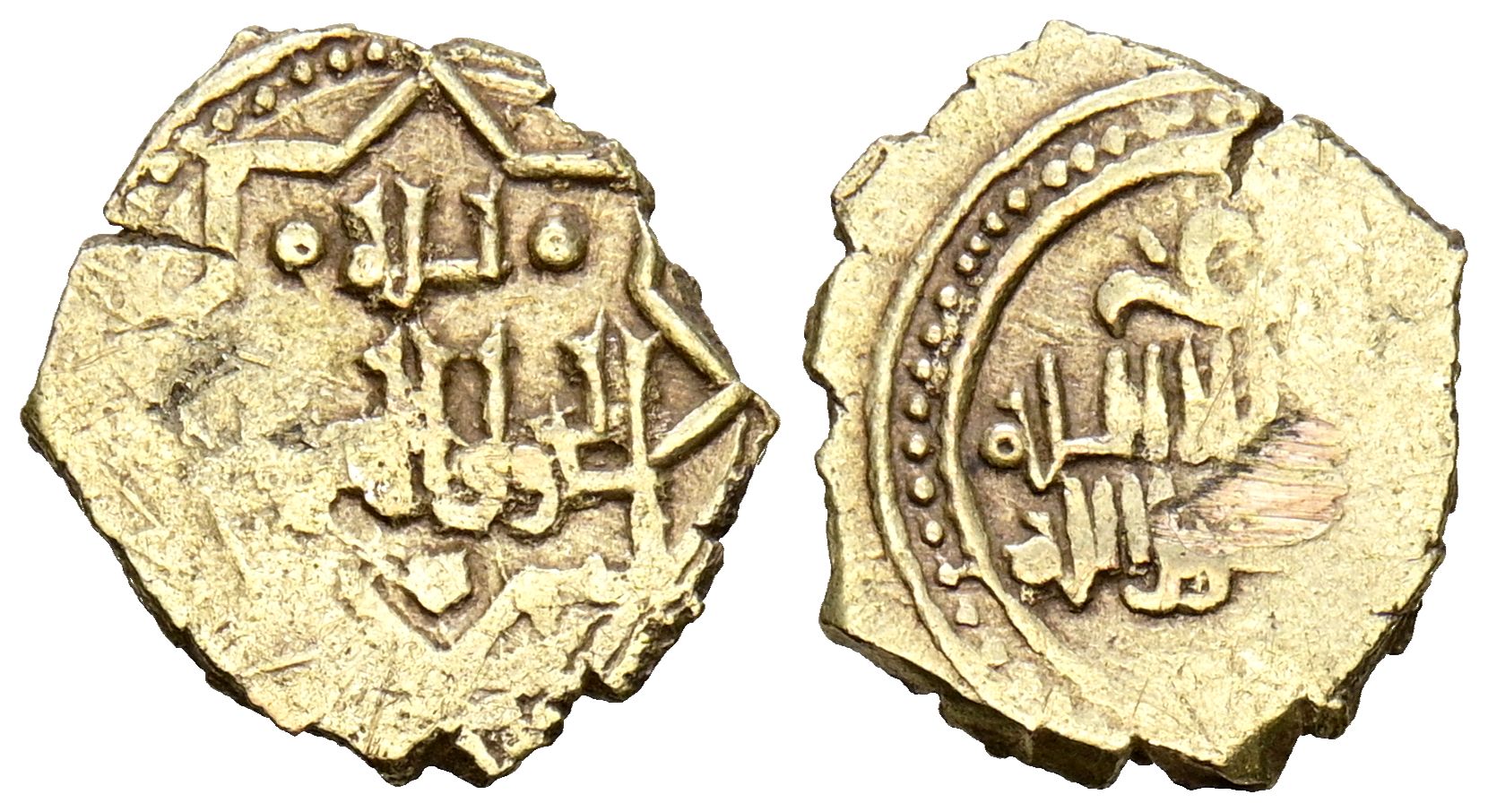 TAIFAS DEL CALIFATO, Anónimo atribuído a Toledo. Fracción de Dinar. (El. 0,79g/13mm). S/D. (Codera y Zaidin (1897) 1047 bis; Ibrahim, Cantó (2003) Suplemento a los Reinos de Taifas, nº 169, Francés nº362). Anuncio: لااله الاالله / محمدرسول الله. Rev: الح و ل و القوة / الله. (Para Dios / el poder y la fuerza). MBC. Escasa.Codera atribuyó esta pieza a Almería ''por tener alguna semejanza con algunos ejemplares del nº 1047 de Vives, aunque en el tesorillo donde aparecieron aquellos ejemplares, también c ontenía otros diferentes de las taifas de Toledo, Badajoz, Córdoba, Valéncia, Dénia y Zaragoza. Sin embargo, precediendo la intuición del doctor Albert Cantó, sería David Francés quien daría un razonamiento más lógico a su origen, en su lib ro ''De la legitimidad, las sucesiones y su reflejo en las acuñaciones andalusíes'' pág. 137-139, justificando la atribución de esta pieza a Toledo, durante la presencia de 'Umar al-Mutawakkil rey de Badajoz'.