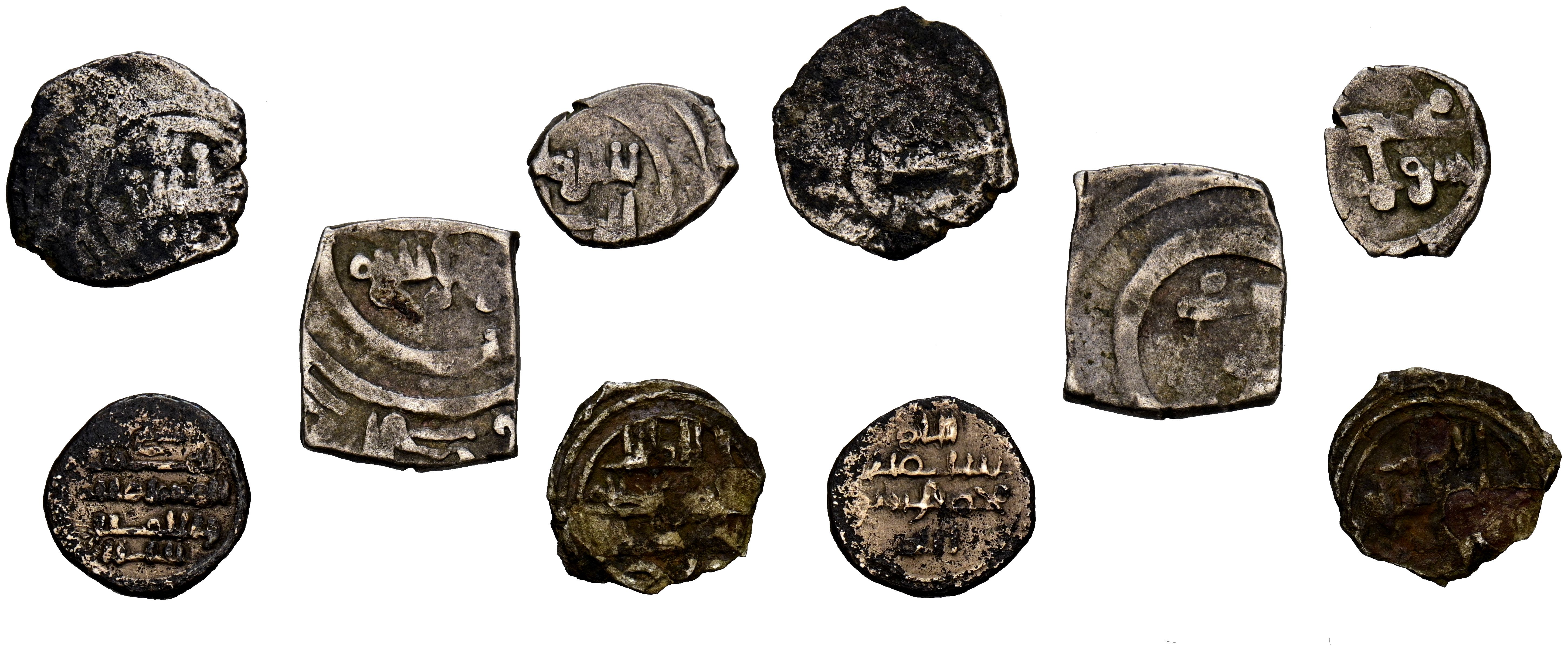TAIFAS DEL CALIFATO Y ALMORAVIDES. Interesante conjunto formado por 5 piezas correspondientes a las taifas de Córdoba y Almería, así como un curioso quirate forrado de Ali Ibn Yusuf. Diferentes módulos y estados de conservación. A EXAMINAR.
