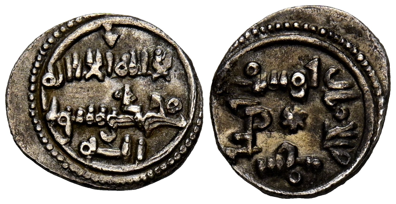 ALMORÁVIDES, Yusuf ben Tashfin (480-500H). Quirate. (Ar. 0,80g/12mm). S/D. (Vives no cita; Hazard no cita; Eustache 83a; Benito Ba14). Anv: 'Shahadah' en tres líneas. Rev: شفين (sufin)/ ابن قا (hijo de Ta)// توسف (Yusuf)/ الامير (el Emir) , en cuad rado con estrella central. SC. Muy rara.