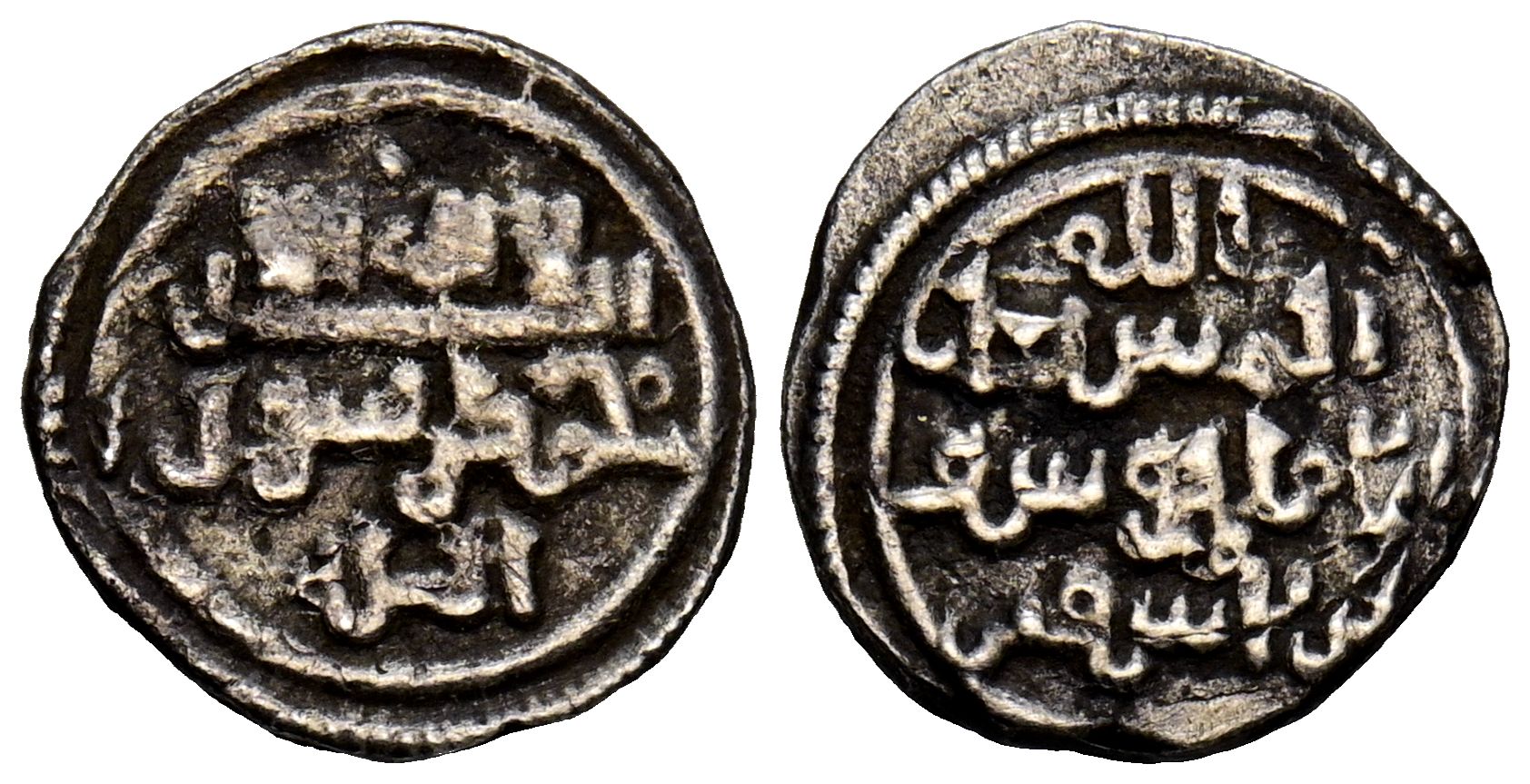 ALMORAVIDES, Yusuf ben Tashfin (480-500H). Quirate. (Ar. 0,90g/12mm). S/D. (Vives no cita; Martínez 2; Eustache 84; Benito Ba16). Anv: 'Shahadah' en cuatro líneas. Rev: Presenta a Yusuf con el titulo de al-Musta'in bi-Allah arriba divido en dos lines : المستعين / بالله. MBC. Rara.Este tipo de Yusuf junto con algunas variantes de Quirate de Ali, son los únicos tipos de todo el periodo almorávide que contiene el título de al-Musta'in bi-Allah ("el que pide la ayuda de Dios").