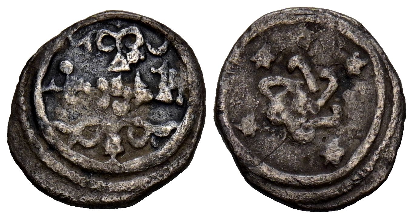 ALMORÁVIDES, Yusuf ben Tashfin (480-500H). 1/2 Quirate. (Ar. 0,45g/11mm). S/D. Anv: En una sola línea: الامير توسف (el Emir Yusuf) con el mismo motivo decorativo encima y debajo de la leyenda. Rev: Sello de Salomón rodeado de 4 diminutas estrellas de 6 puntas en forma de cruz. MBC. Inédito. Único ejemplar conocido.