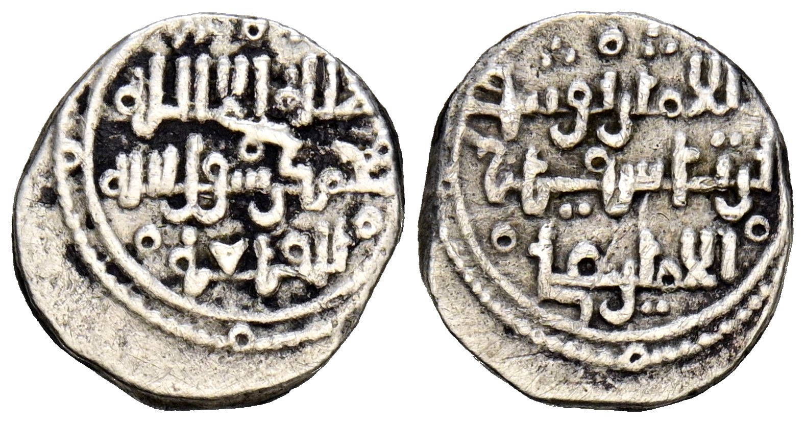 ALMORÁVIDES, Yusuf ben Tashfin y el emir Ali (497-500H). Quirate. (Ar. 0,93g/11mm). al -Qal'ah (Alcalá) / القلعة. Anv: 'Shahada' en dos líneas, debajo ceca: القلعة. Rev: لامير علي / ابن تاشفين / لامير يسف (El emir Yusuf/ibn Tashfin/el emir Ali). MBC. Pátina oscura. Inédita con esta ceca.
