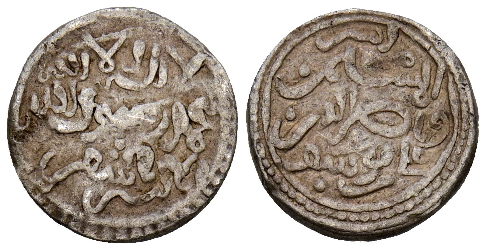 ALMORAVIDES, Ali Ibn Yusuf y el Emir Tashfin (533-537H). Quirate. (Ar. 0,96/11mm). S/D. (Vives 1822; Benito Cj1). Anv: 'Sahada' en dos líneas, debajo cita al heredero: الامير تاشفين. Rev: Presenta a Ali con título de amir al-Muslimin y Nasir al-Din. MBC. Atractivo ejemplar realizado en escritura nesjí.