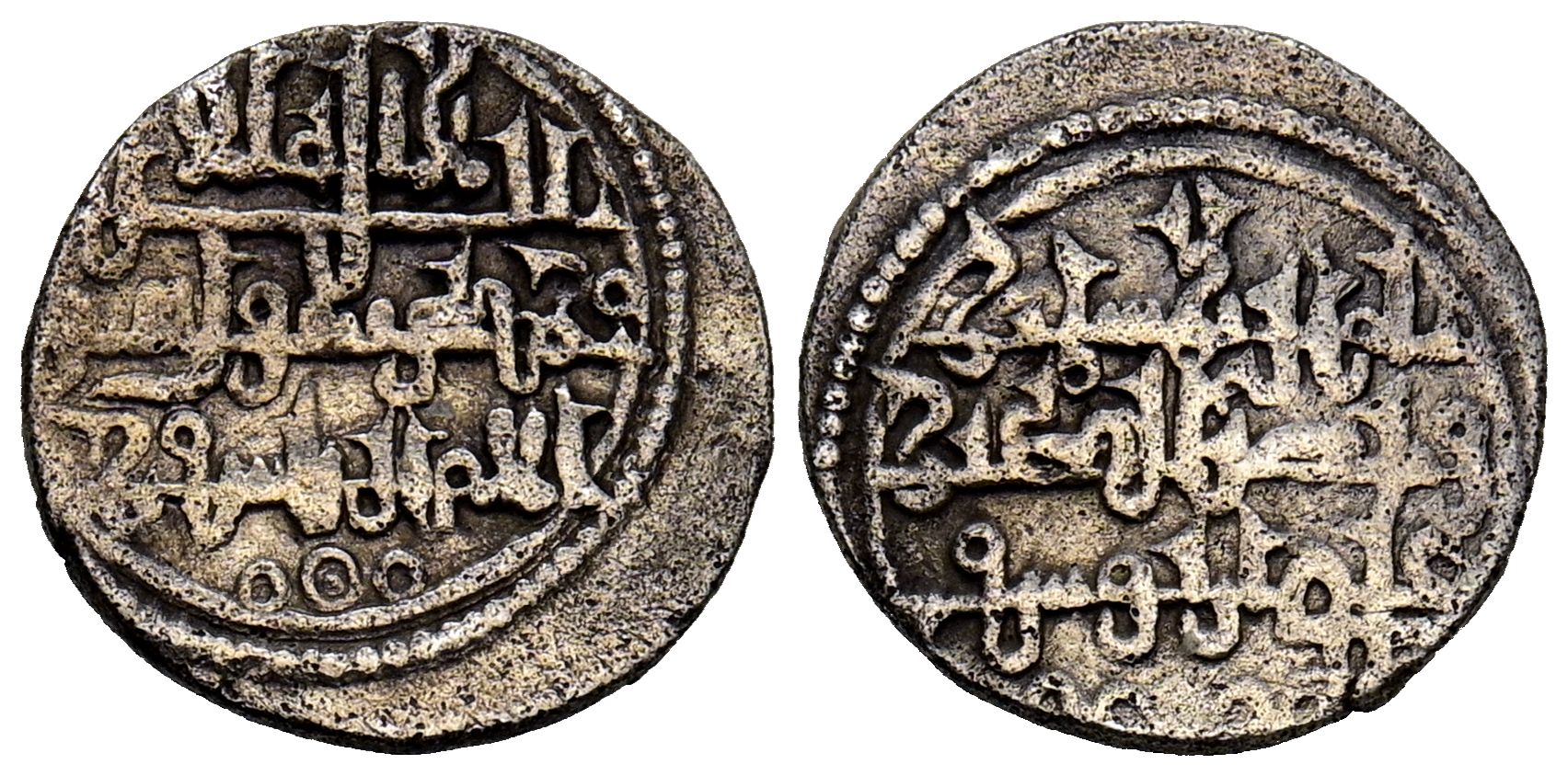 ALMORAVIDES, Ali ben Yusuf y el Emir Tashfin (533-537H). Quirate. (Ar. 0,90g/12mm). S/D. (Benito Cj3, variante en cúfico ornamental). Anv: 'Shahadah' en tres líneas, abajo cita al heredero: قا شفين. Rev: Presenta a Ali con títulos de Amir al-Muslimin y Nasir al-Din. MBC+.